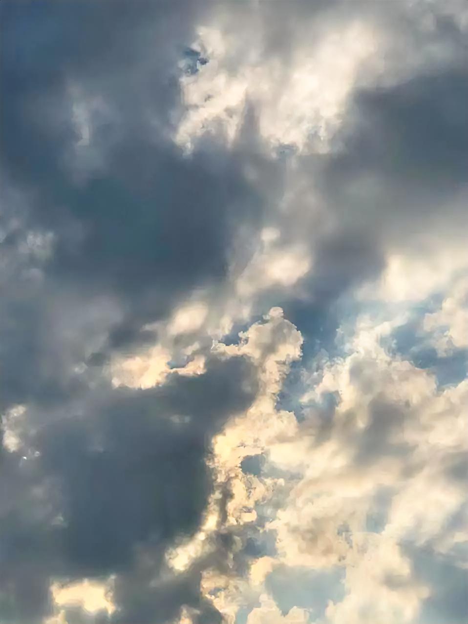云隙 云层在头顶翻涌,像未被梳理的心事,沉沉地压着。暗灰的云絮裹住天光,只在罅隙处漏出几缕金芒,落在蓬松的云团边缘,晕开暖融融的轮廓。 风掠过的时候,云的形状在悄然改变,厚重的部分慢慢散开,轻薄的絮状云被吹向远方。那些藏在云后的蓝,一点点显露出来,像久闭的窗被推开,涌进新鲜的空气。 原来天色从不会一直阴沉,就像生活里的困顿,终会被风拂开。抬头望时,光总在云隙间,未曾走远。