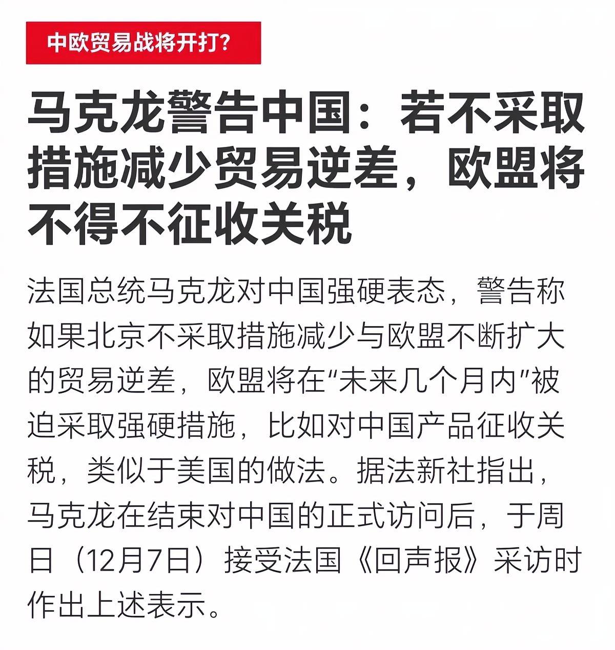 感谢中国是真的,威胁对华加征关税也是真的。一回国就变色,马克龙真的“没让人失望”。 马克龙“既要又要”的本质是欧盟夹在中美之间的平衡困境。 欧盟离不开中国,正如美国对中国的经济依赖。可马克龙遇到特朗普交通管制,也不得不下车步行,美国的淫威迫使马克龙寻求独立自主的道路上经常反复。 外交一直都是求同存异。各个国家有各个国家的利益,即便塞尔维亚、巴基斯坦这些传统的“铁哥们”,依然也并没有绝对锁死对美开放的大门。这个世界上唯一铁肩的朝鲜,也不可能只听中国的。 所以说,对马克龙的变色,我们应该早有预料,不过是希望他在一些领域能说话算话,也不枉此行。