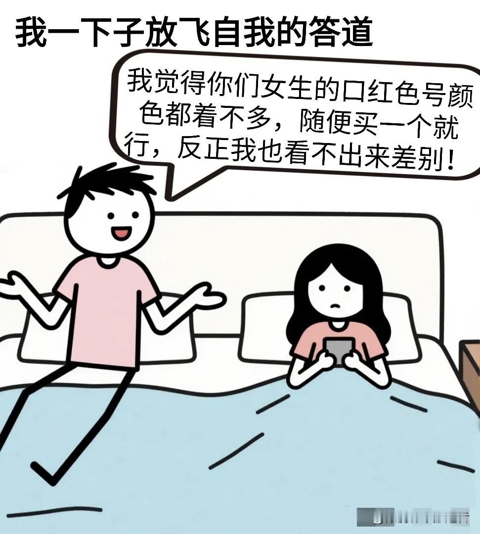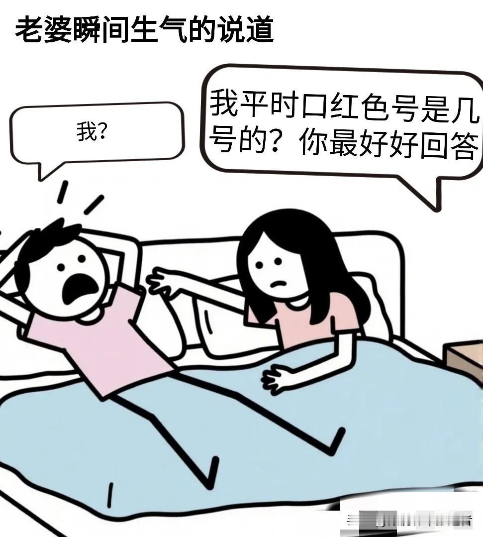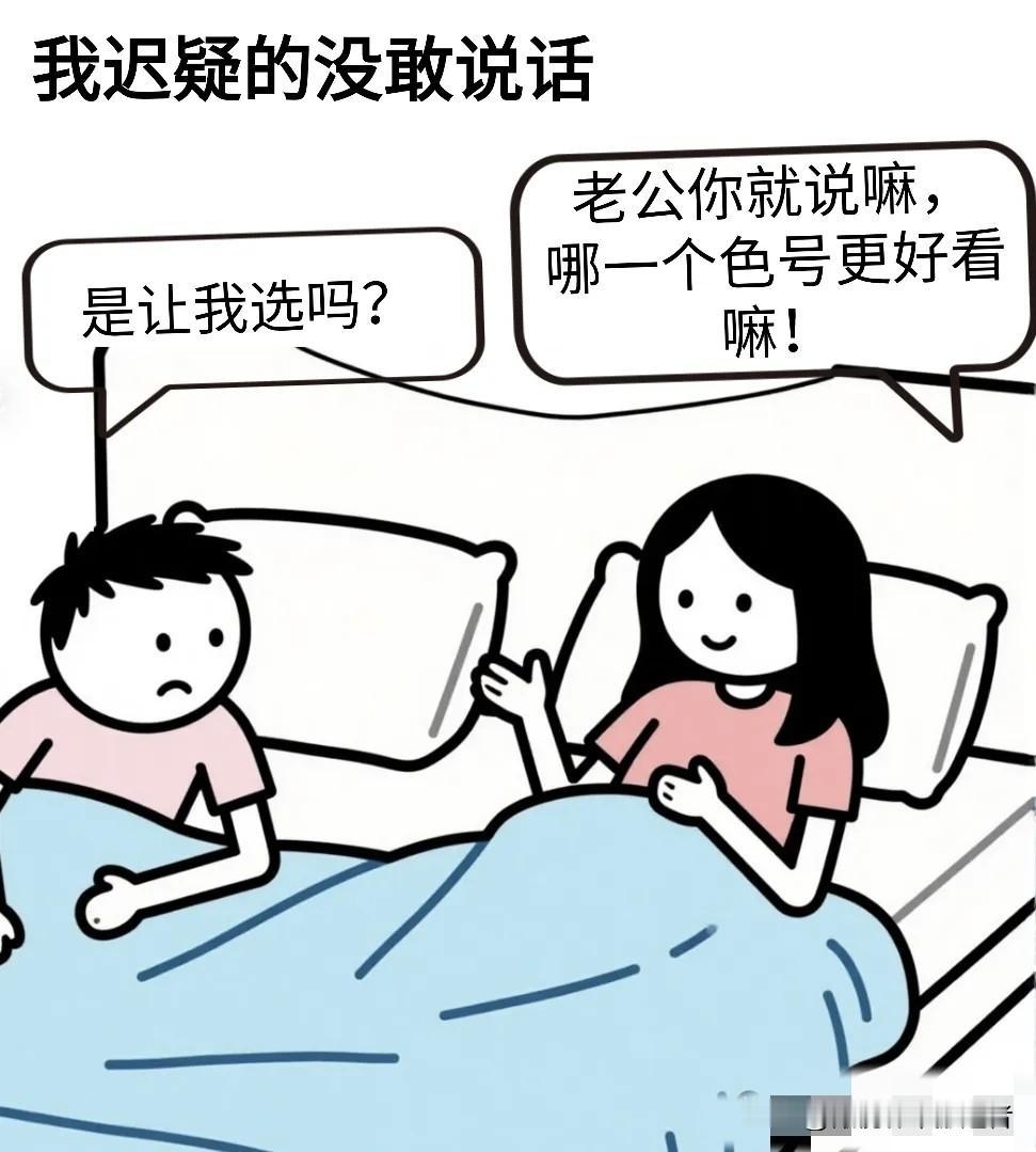 趣味漫画:老婆问:老公,你看这两个口红色号哪个好看?我:我觉得你们女生的口红色号都着不多,随便买一个就行,反正我也看不出来差别!