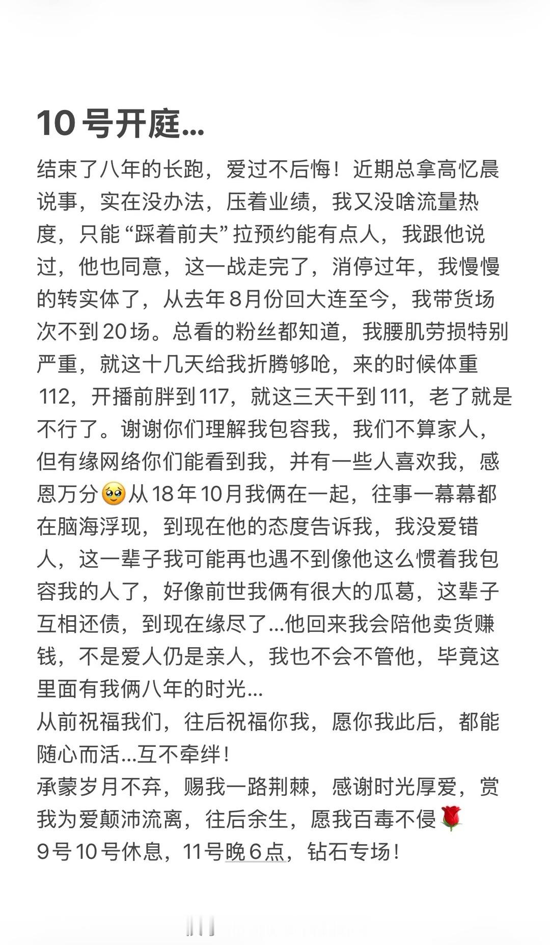 🔴大连冰冰高忆晨10号开庭,等他回来会陪他卖货赚钱!不是爱人仍是亲人!结束了8年的长跑,爱过不后悔,最近总拿高忆晨说事,实在没办法,压着业绩,我又没啥流量热度,只能踩着前夫拉预热能有点人,他也同意。从2018年10月我俩在一起到现在,他的态度告诉我,我没爱错人。这一辈子我可能再也遇不到像他这么惯着我包容我的人了,前世瓜葛这辈子互相还债,到现在缘分尽了。他回来我会陪他卖货赚钱,不是爱人,是亲人,我也不会不管他,毕竟这理由我俩8年的时光。这一路有幸同行,爱过一场…谢谢你曾给过的温暖,愿你我各有新天地。到站了,我该下车了…