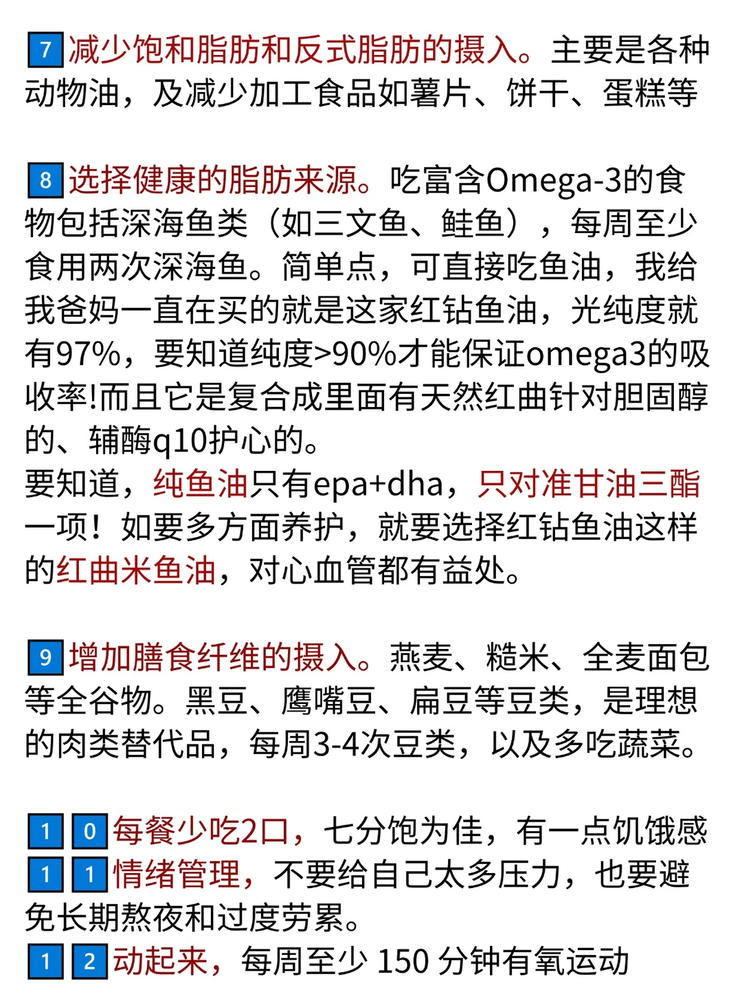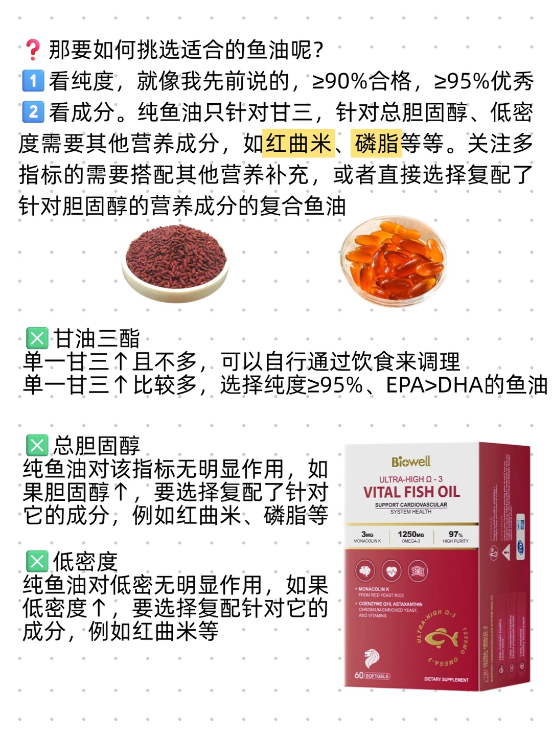 ◾️看成分。纯鱼油只针对甘三,针对总胆固醇、低密度需要其他营养成分,如【红曲米】、【磷脂】等等。关注多指标的需要搭配其他营养补充,或者直接选择复配了针对胆固醇的营养成分的复合鱼油