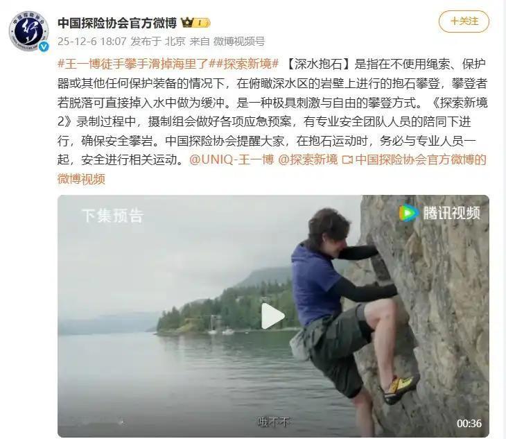 12月6日,“王一博徒手攀手滑掉海里了”片段引发关注,相关话题登上热搜。据中国探险协会介绍,这是专业极限运动项目——深水抱石,此次落水是正常脱落流程。 王一博挑战的深水抱石是在不使用保护装备的情况下,在俯瞰深水区的岩壁上进行攀登,脱落可掉入水中缓冲,极具刺激与自由。录制时摄制组有应急预案,配备专业安全团队,落水点约3.8米、海水深2.4米以上、浪高控制在0.3米内,且前期请专业替身做了20次落水测试,现场还有救生艇、医疗团队和安全监护顾问。 王一博落水后仅30分钟便重返岩壁继续挑战,展现出冷静和体能。不过节目“隐形防护”也引发争议,观众希望看到安全保障的实锤证据。总体而言,这次挑战让“深水抱石”出圈,也展现了王一博对户外探险的热爱与勇敢。