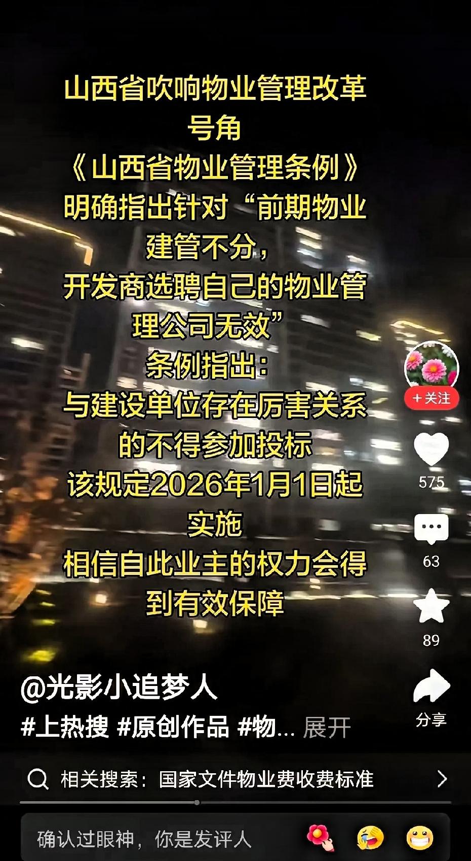 物业要变天了。 昨天新闻已经报道了,山西省物业从2026年1月1日起,执行新的物业管理条例。 前期物业公司效力作废,开发商自行选聘的物业公司不具备合规资质,与开发商存在利益关联的物业公司也将被排除在外,这一举措给全国物业行业规范化发展开了个好头。 过去多年,不少小区的物业矛盾都源于开发商与物业的绑定关系。很多开发商会直接指派旗下关联物业入驻小区,这类物业往往仗着和开发商的特殊联系,在服务上有所懈怠:小区公共区域保洁不及时、公共设施维修拖沓、安保巡查流于形式都是常见问题。 而业主想更换物业时,又会因物业和开发商的利益牵扯遇到阻碍,只能被迫接受不尽如人意的服务,物业费的价值也没能真正体现。 山西新规的关键价值,在于从源头斩断了这种不合理的“裙带关联”,让物业回归服务业主的核心职责。 消息传开后,网友们纷纷表达支持,不少人提出配套建议:有人呼吁各地设立专门的物业账目审计机制,公开物业费收支明细,杜绝挪用、私吞情况;也有人建议强化对物业和业委会的监管,破除二者可能存在的利益勾结,确保业主权益不受损害。 其实业主的诉求很简单,只是希望物业能切实履行职责,维护好小区居住环境。山西的新规既给当地业主吃下定心丸,也为其他地区提供了可参考的治理思路,让大家看到了规范物业行业的切实路径。