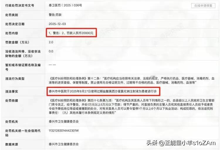 谁为“过期药”负责?患者输液后不适,医院被罚仍辩称“无关” 2025年8月,泰州泰兴的王女士因肺炎入住当地中医院治疗,却在输液时被使用了过期44天的盐酸莫西沙星氯化钠。此后,她出现发热、胸闷等不适反应。令人愕然的是,院方起初声称“不影响身体”,坚持症状与过期药无关。 事件经患者投诉后,泰兴市卫生健康委员会介入调查,并于12月3日依法对该医院作出罚款2万元并警告的行政处罚。这一处罚明确了医院使用过期药品的违规事实。 然而,截至12月8日,涉事医院仍未向王女士给出正式说法与合理解释,继续坚持其不适是“自身原因”。此举引发公众广泛质疑:在监管部门的罚单已然开具的情况下,医院对自身管理漏洞的漠视和对患者关切的逃避,何时才能终结? 药品安全,尤其是直接注入人体的输液药品,关乎生命健康,容不得丝毫马虎。过期药品存在效价降低、杂质增多等明确风险。医院作为守护健康的第一线,其药事管理的严格规范是基本底线。事件曝光后,有网友评论:“罚款是对过去的纠错,真诚的反思与整改才是对未来的负责。” 面对白纸黑字的处罚,医院若仍停留在“自说自话”的推诿阶段,不仅寒了患者的心,更损害了医疗行业应有的公信力。公众期待的,从来不仅是一张罚单,更是一份严肃的整改、一个真诚的道歉,以及一套杜绝此类事件再次发生的可靠机制。生命健康不容试错,安全管理没有借口。