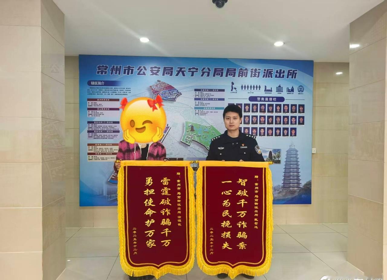 为民挽损获锦旗】12月5日,印着“智破千万诈骗案 一心为民挽损失”“雷霆破诈骗千万 勇担使命护万家”的两面锦旗送至天宁公安分局局前街派出所,群众紧握民警双手表达诚挚谢意。此前,辖区群众遭遇重大诈骗,涉案金额高达千万元。接警后,民警迅速出击,循线追踪、缜密侦查,克服线索零散等多重困难,精准锁定嫌疑人轨迹,最终成功破案并将嫌疑人抓获,全力为群众挽回经济损失。锦旗虽轻,情谊深重。局前街派出所将持续聚焦民生诉求,严打各类电信网络诈骗犯罪,以实际行动守护辖区群众财产安全。@江苏政法 @江苏警方