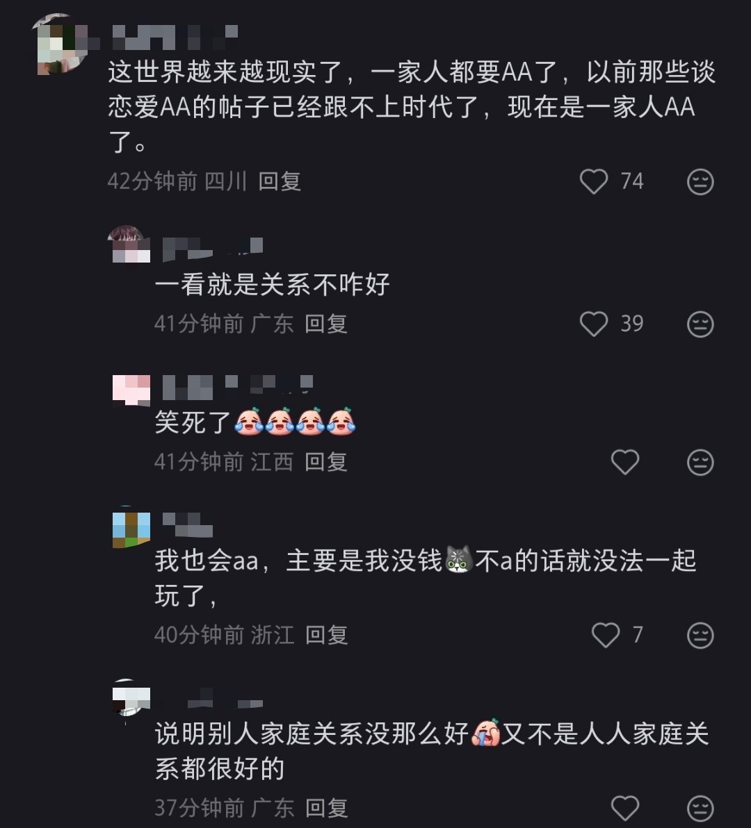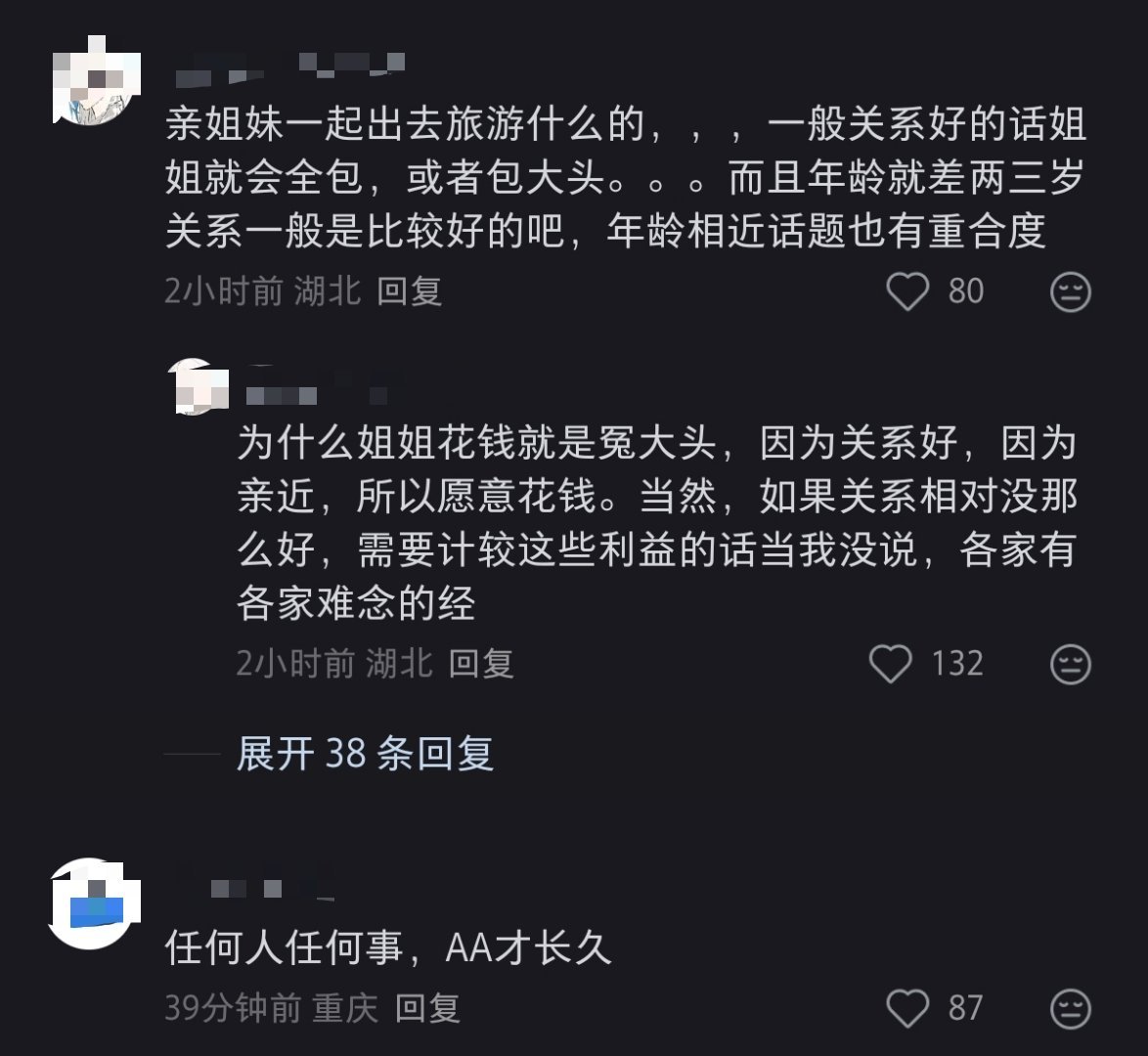 亲姐妹出去旅游,AA怎么了?不喜欢那种AA就说都是一家人,这样分太清楚了。或者直接把亲人AA打成关系不好。大家都是成年人,挣钱都不容易,不是姐姐就应该给妹妹付钱,包旅游费。再说,姐姐又不是富婆,大家不过都是社会上的普通牛马而已。即使AA,姐姐在旅游过程中多照顾妹妹,这就不是亲情和关心了吗?非得在钱上照顾才算亲情?很多家庭的很多积怨,往往就是因为一家人在钱上分的太不清楚,有的人一直吃亏。小时候无所谓,但大家都上班了,社会人了,不管姐姐是不是想包妹妹的旅游费用,至少妹妹的态度都不应该是,你是姐姐,你就应该多出钱,这样才算有亲情。我觉得真是亲人,感情真的好,才只会更心疼姐姐,怕自己花姐姐的钱给她增加经济负担。