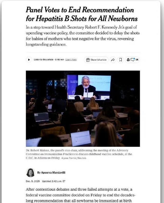 炸裂!美国卫生部长肯尼迪的专家组投票决定停止建议所有新生儿接种乙肝疫苗。经过激烈的辩论和三次投票失败后,联邦疫苗委员会于周五决定终止了所有新生儿在出生时都应接种乙肝疫苗这项延续了数十年的建议。这次投票对卫生部长小罗伯特·F·肯尼迪来说是一次胜利,他几十年来一直致力于改革儿童疫苗接种计划。 美国疾控中心下属的免疫实践咨询委员会12月5日以8比3票数通过一项调整,把新生儿乙肝疫苗出生剂量从普遍推荐改为母亲检测阴性时由父母和医生个别决定是否接种。这项政策自1991年起实施三十多年,一直是防控乙肝的关键措施,现在被推翻,引发医学界强烈反对。 小罗伯特·F·肯尼迪长期质疑疫苗必要性,上任卫生部长后直接解雇原委员会全部17名成员,换上新一批人,其中不少人持疫苗审慎态度。新委员会工作组审查乙肝疫苗时,由护士维基·佩布斯沃思牵头,她来自一个质疑疫苗安全的组织,其他报告人包括气候科学家和商业人士,缺乏肝病专家参与。会议上,有人强调美国乙肝流行率已很低,低风险婴儿出生感染概率极小,认为没必要一出生就打。 反对声音主要来自儿科教授科迪·迈斯纳,他是唯一有前委员会经验的成员,指出病毒传播途径不止母婴,还包括家庭日常接触,很多携带者自己都不知道。数据显示,普遍出生剂量实施后,美国儿童乙肝感染率下降99%,慢性病例大幅减少。委员会还是坚持调整,还另外以6比4通过建议后续剂量前考虑抗体检测,尽管没有证据显示标准三剂不够。 这项变化不影响高风险婴儿,比如母亲阳性或未知的,仍要在出生12小时内接种加免疫球蛋白。疫苗保险覆盖暂时不变,儿童疫苗计划继续支持。但专家担心,推荐弱化会让医生和家长产生误解,以为疫苗有问题,导致接种率下降,慢性感染病例反弹。 美国儿科学会和免疫协会直接批评这是倒退,路易斯安那州参议员比尔·卡西迪作为肝病医生公开说这是错误,敦促疾控中心代理主任别采纳。一些前官员辞职抗议,认为委员会已偏离科学依据。肯尼迪把这当成儿童疫苗改革成果,继续推动审查其他项目。 中国情况完全不同,我们曾经乙肝高发,2002年纳入免疫规划后,新生儿出生24小时内打第一针,5岁以下儿童携带率降到0.3%以下,效果明显。国家卫健委反复强调,乙肝疫苗仍是防控重点,尤其是阻断母婴传播。 家长不用慌,美国调整基于他们低流行背景,我们的政策不会变,疫苗这东西,科学数据摆在那,安全有效用了这么多年,保护孩子健康还是第一位。