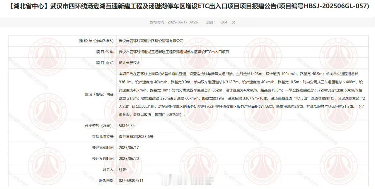 四环线汤逊湖互通工程及汤逊湖停车区开工! 来自群友的投稿,位于江夏区的四环线汤逊湖互通工程及汤逊湖停车区即将开工。 据悉,本项目为在四环线上增设的A型单喇叭互通,设置连接线与武昌大道衔接。主线全长1423m,设计速度 100km/h,路基宽 40.5m;单向单车道匝道总长936.1m,设计速度为 40km/h,路基宽9.0m;单向双车道匝道总长312.7m,设计速度为 40km/h,路基宽10.5m;对向分隔式三车道匝道总长408m,设计速度为40km/h,路基宽18m;对向分隔式四车道道总长 862m,设计速度为40km/h,路基宽19.5m;一级公路连接线总长 720m,设计速度 60km/h,路基宽 21.5m;被交路改建 320m设计速度 60km/h,路基宽度19m;设置桥梁 3367.9m/10座。设汤逊湖互通“4入5出”匝道收费站1处,汤逊湖停车区“2入2出”ETC出入口1处,对汤逊湖停车区的服务功能进行优化提升原停车区服务广场面积为17.6亩,新增用地约3.9亩,扩建后服务广场面积约21.5亩。