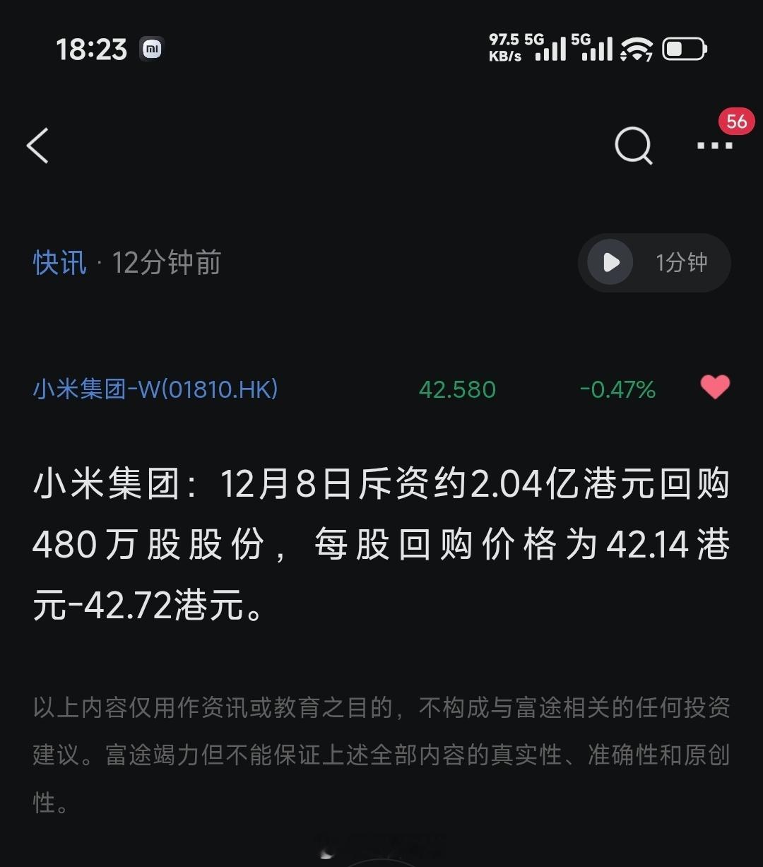 【米东快讯】今日回购 2 个亿 小米集团:12月8日斥资约2.04亿港元回购480万股股份,每股回购价格为42.14港元-42.72港元。