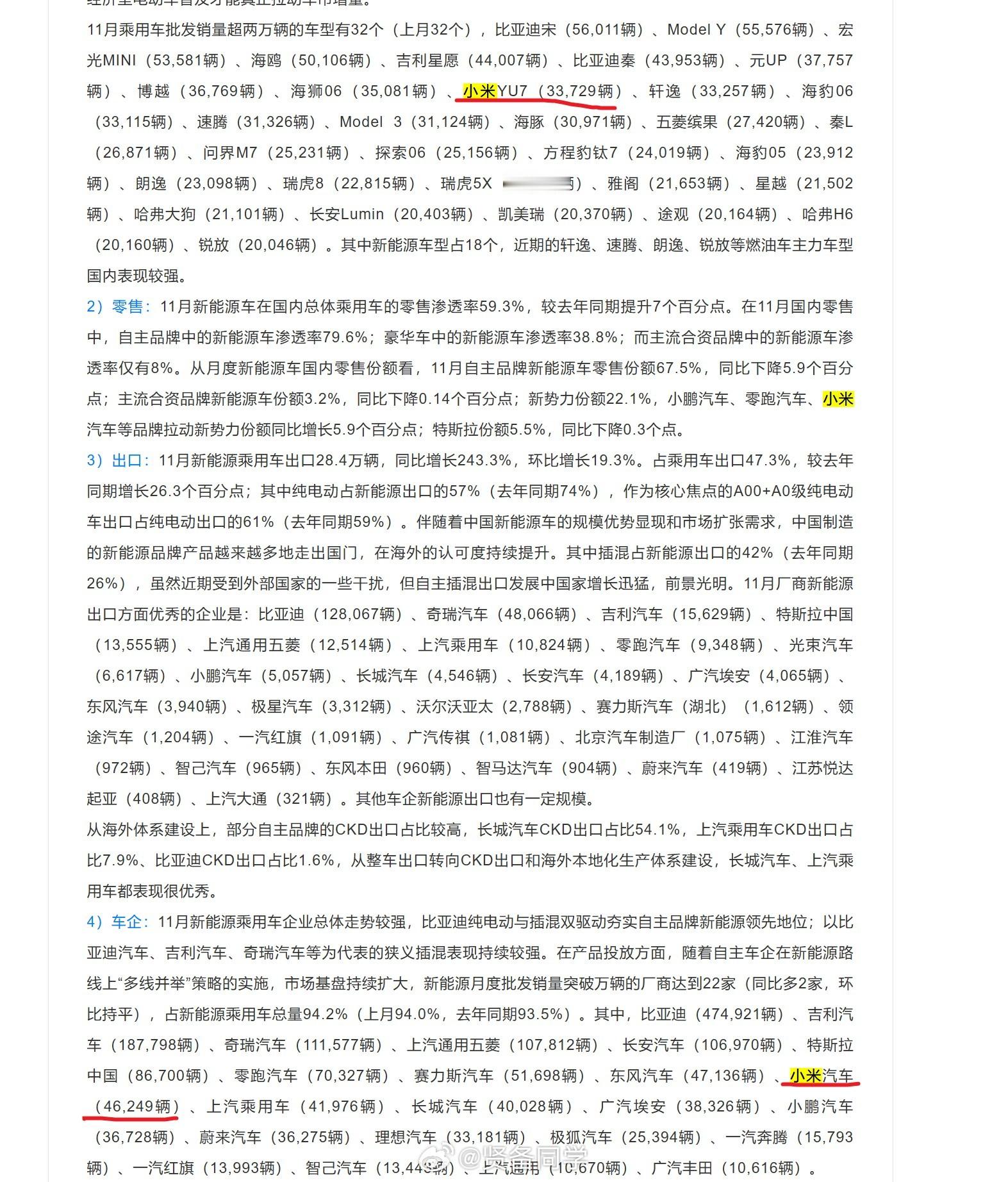 小米汽车 11 月销量 46249 辆、其中小米 YU7 为 33729 辆!10 月销量为 48654 辆、其中 YU7 为 33662 辆小米汽车