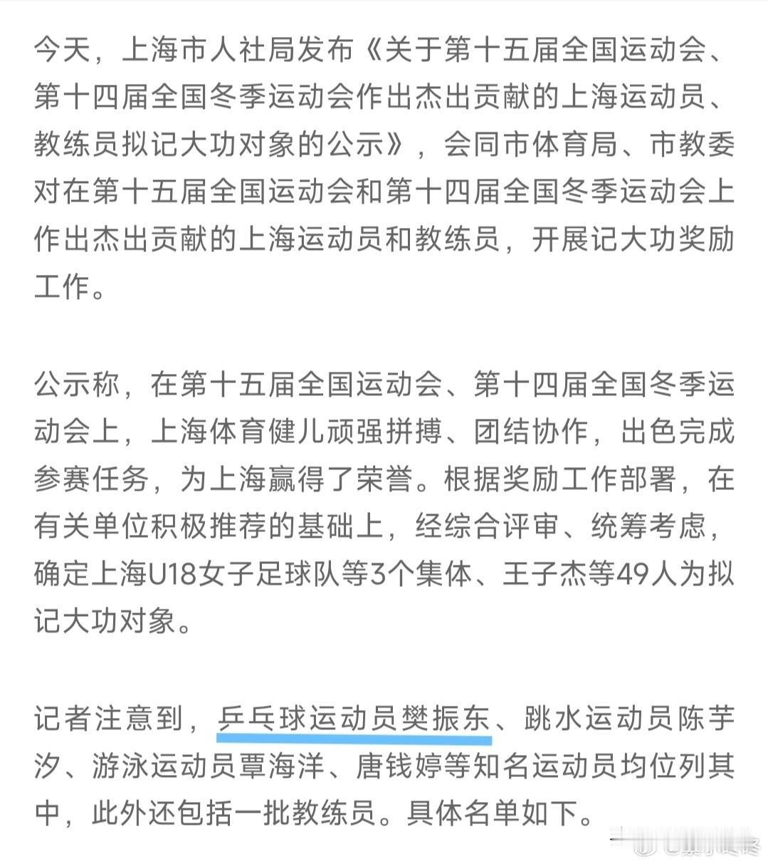 樊振东又获殊荣! 樊振东因在第十五届全运会成功卫冕男单冠军,并为上海队夺得男团银牌,近日樊振东出现在《关于第十五届全国运动会,第十四届全国冬季运动会作出杰出贡献的上海运动员,教练员拟记大功对象的公示》名单中! 上海乒乓球队同样出现在名单中的仅两人,除了樊振东,还有一个是张洋指导!恭喜樊胜振东,恭喜张洋,运动员出成绩,教练员也会被表彰,真好。 樊振东,他值得更多荣誉和奖励!