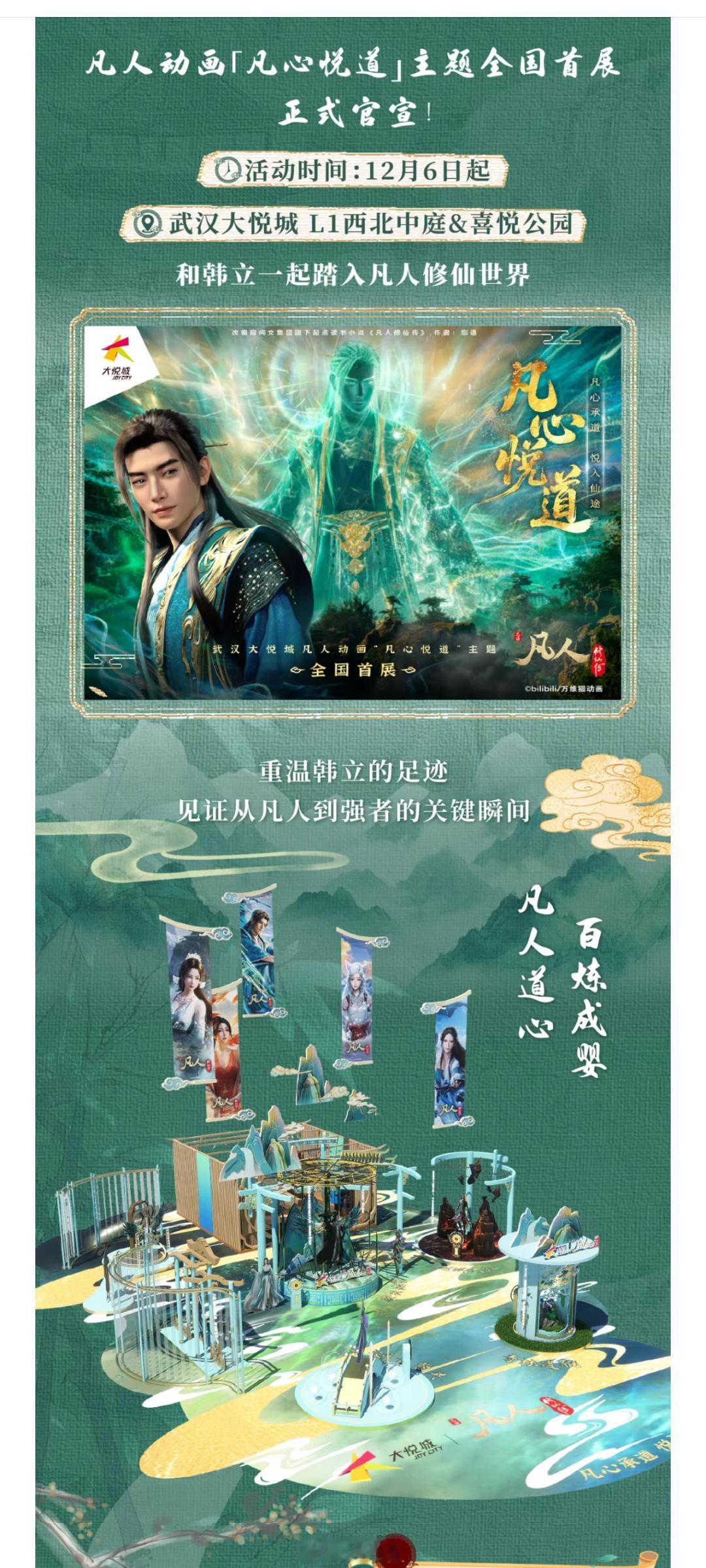 凡人动画全国首展在武汉大悦城举行! 12月6日,令二次元迷“上头”的“顶流之作”冲破屏幕走进现实——“凡心悦道”主题全国首展落户光谷,于武汉大悦城正式开展。(现场图来自群友)