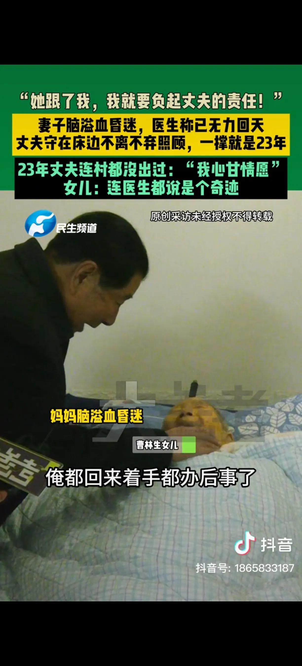 妻子突发脑溢血icon,被送往医院后已无力回天,许多人都劝丈夫放弃。但丈夫却说:“只要她还有一口气,我就绝不放弃她。只要我还在,就会伺候她一天。”随后,他把妻子带回家,悉心照料23年。 亲戚朋友轮番劝他,说这样的日子没有头,趁着年轻再找个伴,别把自己一辈子搭进去。他每次都摇摇头,转身就去给妻子擦身、喂饭,动作熟练又轻柔。 家里的积蓄早就花光,为了给妻子买药、做康复,他每天打两份工,凌晨出门深夜才归,再累也会先检查妻子的状况。孩子心疼他,说自己可以多照顾妈妈,让他歇歇,他却怕孩子照顾不好,始终亲力亲为。 有人背后议论,说他太傻,守着个“植物人”妻子不值得,甚至有人怀疑他是为了名声装样子。这些话传到他耳朵里,他从不辩解,只是默默把妻子的房间收拾得更干净,把饭菜做得更合口味。 23年里,他没出过远门,没参加过一次朋友聚会,所有的生活重心都围绕着妻子。每天清晨,他会给妻子讲外面的新鲜事;晚上,会握着她的手哼年轻时的歌谣。 直到去年冬天,妻子在睡梦中安详离世,他抱着妻子的遗体,哭了很久很久。周围的人这才明白,他不是傻,也不是装,是把对妻子的爱,融进了日复一日的照料里。 这份跨越二十多年的坚守,让很多人动容。有人说这是爱情最美的样子,也有人说换做自己未必能做到。 各位读者你们怎么看?欢迎在评论区讨论。 来源:大参考 2025-12-5采访