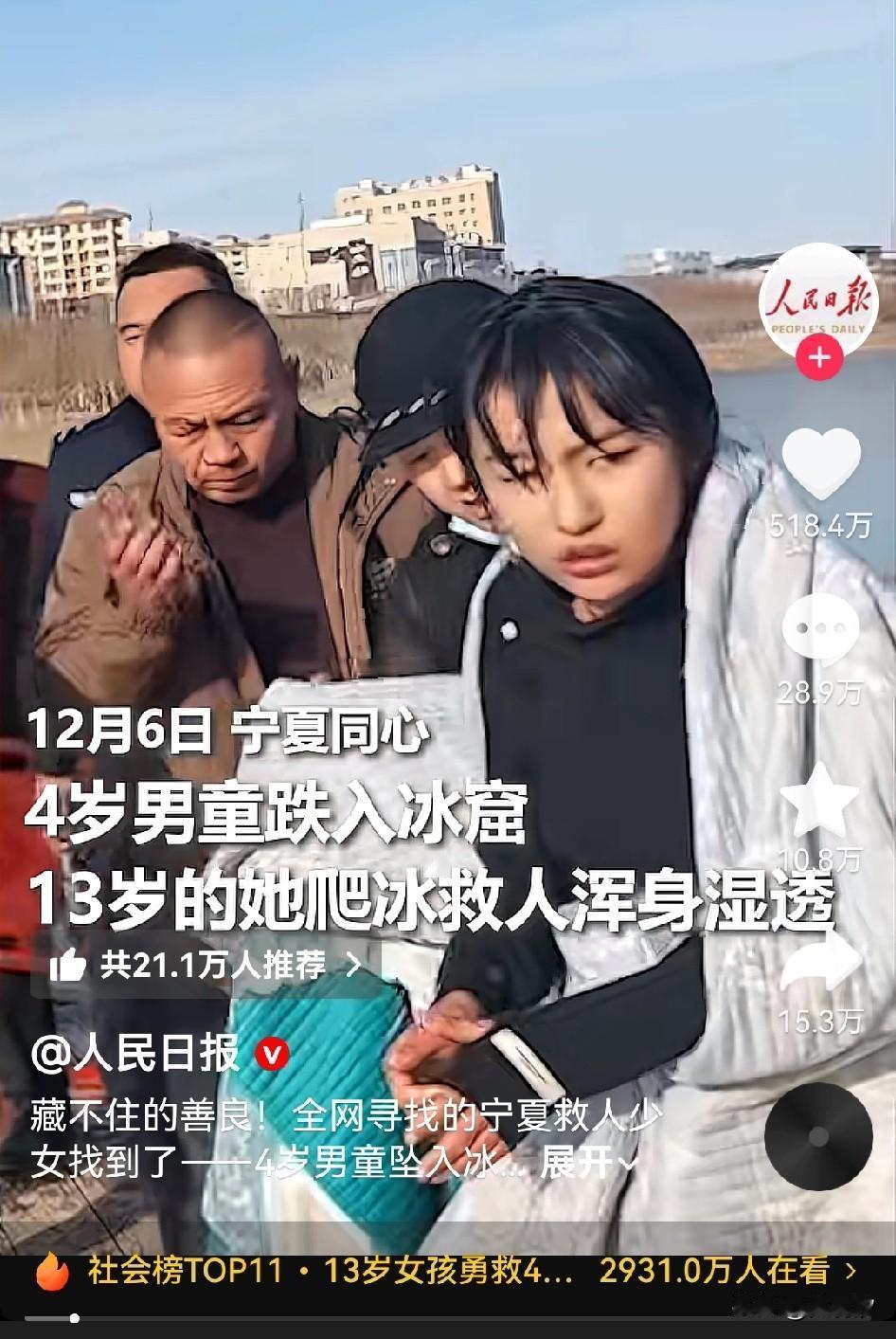 冰窟旁的“微光英雄”:13岁宁夏女孩的冬日壮举! 12月6日下午,宁夏吴忠同心县豫海湖的冰面上,一声哭喊揪紧了所有人的心——4岁男童轩轩踩碎薄冰坠入刺骨湖水,岸边大人因担心冰面坍塌不敢靠近。危急时刻,13岁女孩李佳婷骑车路过,喊出“我身体轻,我下去救”,接过大人们递来的管子,匍匐着向冰窟挪动。 她把管子塞到男童手中,却因冰面二次破裂一同落水。零下5℃的湖水冻得她发抖,可她死死攥着管子没松手,直到被岸边群众拉上岸。消防员赶到救出男童后,浑身湿透的李佳婷悄悄骑车回家,面对父亲询问只谎称“被洒水车淋湿”。 直到姑姑刷到救人视频,这场“沉默的壮举”才被揭开。这个留守在家、常帮奶奶照顾妹妹的女孩,用稚嫩身躯扛起了生命重量,她腼腆的一句“就想救小弟弟”,成了这个冬天最暖的光。