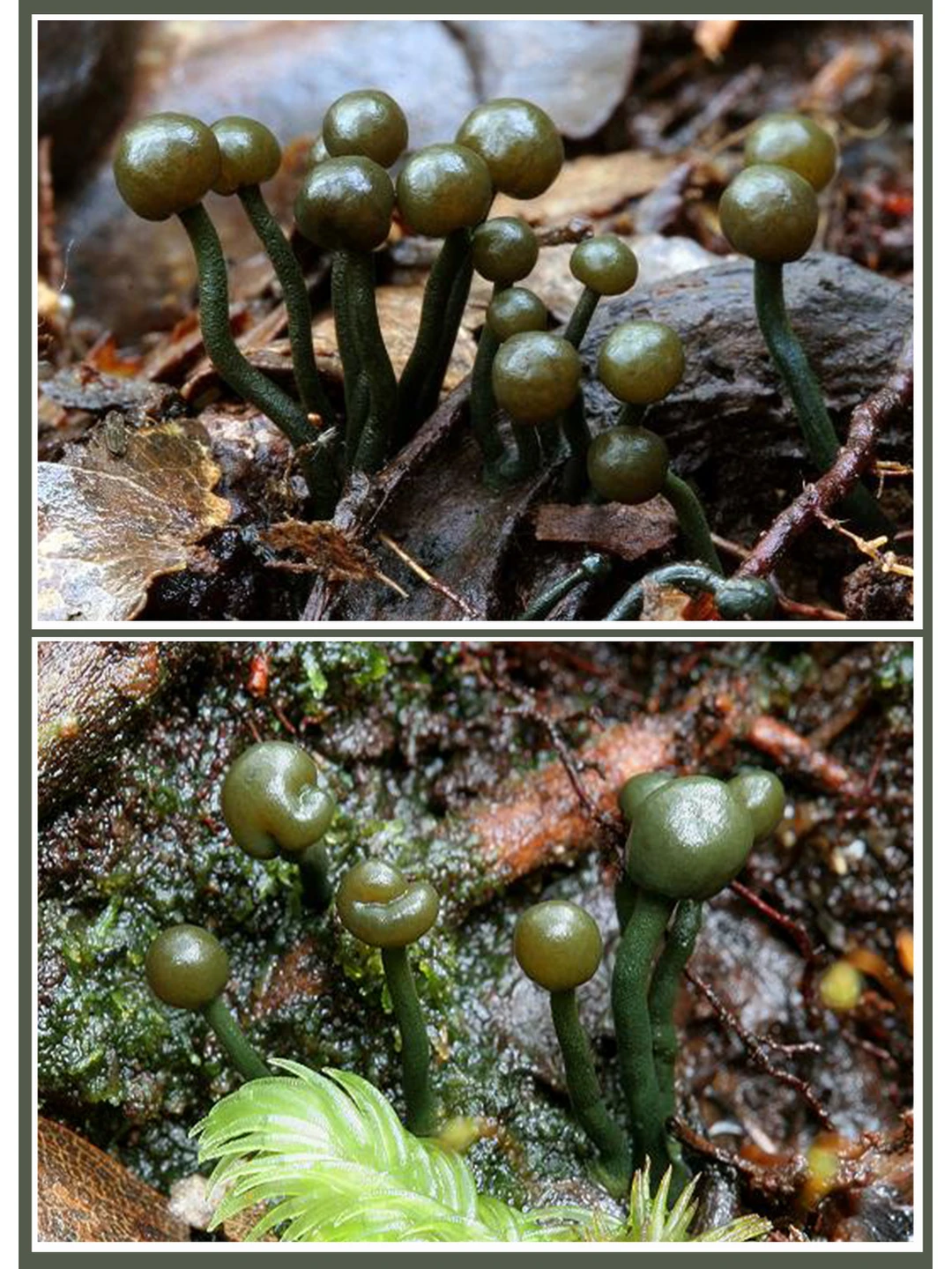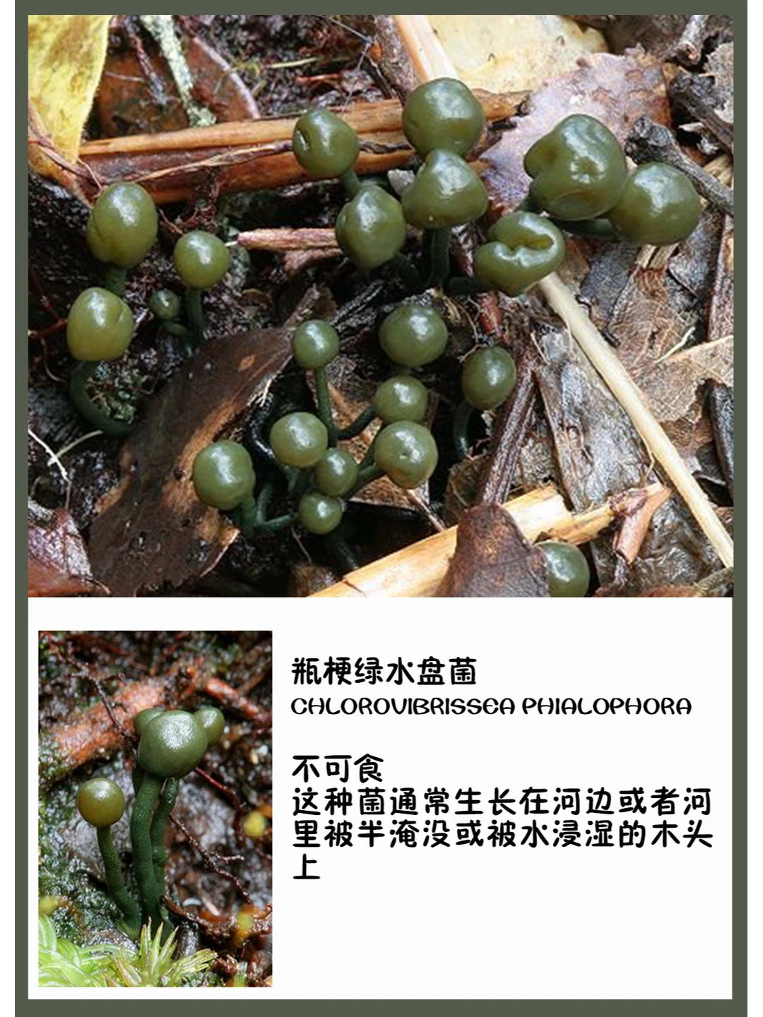 瓶梗绿水盘菌 chlorovibrissea phialophora 不可食 这种菌通常生长在河边或者河里被半淹没或被水浸湿的木头上