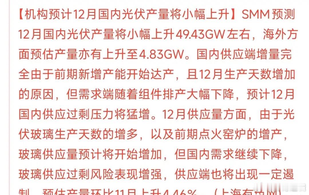 光伏又要开始出现增产情况,产能过剩将在12月发生本来光伏行业加入“反内卷”之后,行业的情况开始好转,组件都开始涨价回升,行业一片向好。但现在机构预测12月光伏行业的量产会增加 但是需求量并没有增加,也就是说光伏的产能过剩是一定的了。光伏今年的平均表现还是可以的,资本市场光伏板块今年反弹27.61%,但由于下面几个月的预期并不好,这两个月正在回调。如果光伏行业产能过剩多少都会影响后续懂王发展,这并不是一个好消息,还是要谨慎对待。