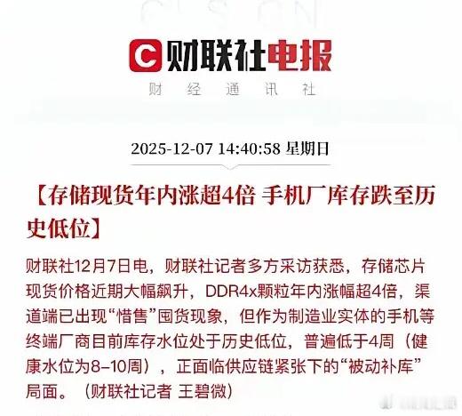 现在存储现货,今年年内已经涨了四倍,而且手机厂商的库存跌到了历史的低位,所以接下来的价格上涨还会持续,那么根据这个库存持续减少,手机厂商下来会大量的购买存储芯片,存储器来填补库存,如果不加大库存,或许手机厂商会出现断供的现象,因为AI人工智能在快速的发展,对芯片需求量暴增,大量的吞噬了存储芯片,如果只是拿现货的话,一时半会拿不到现货,厂商就会停产停工,当前,芯片依然是短缺的趋势,那随着AI应用加速发展,芯片短缺可能还会持续到后年,大概就是2027年左右吧,明年应该也会是一个短缺的时期,现在的存储芯片是供不应求!