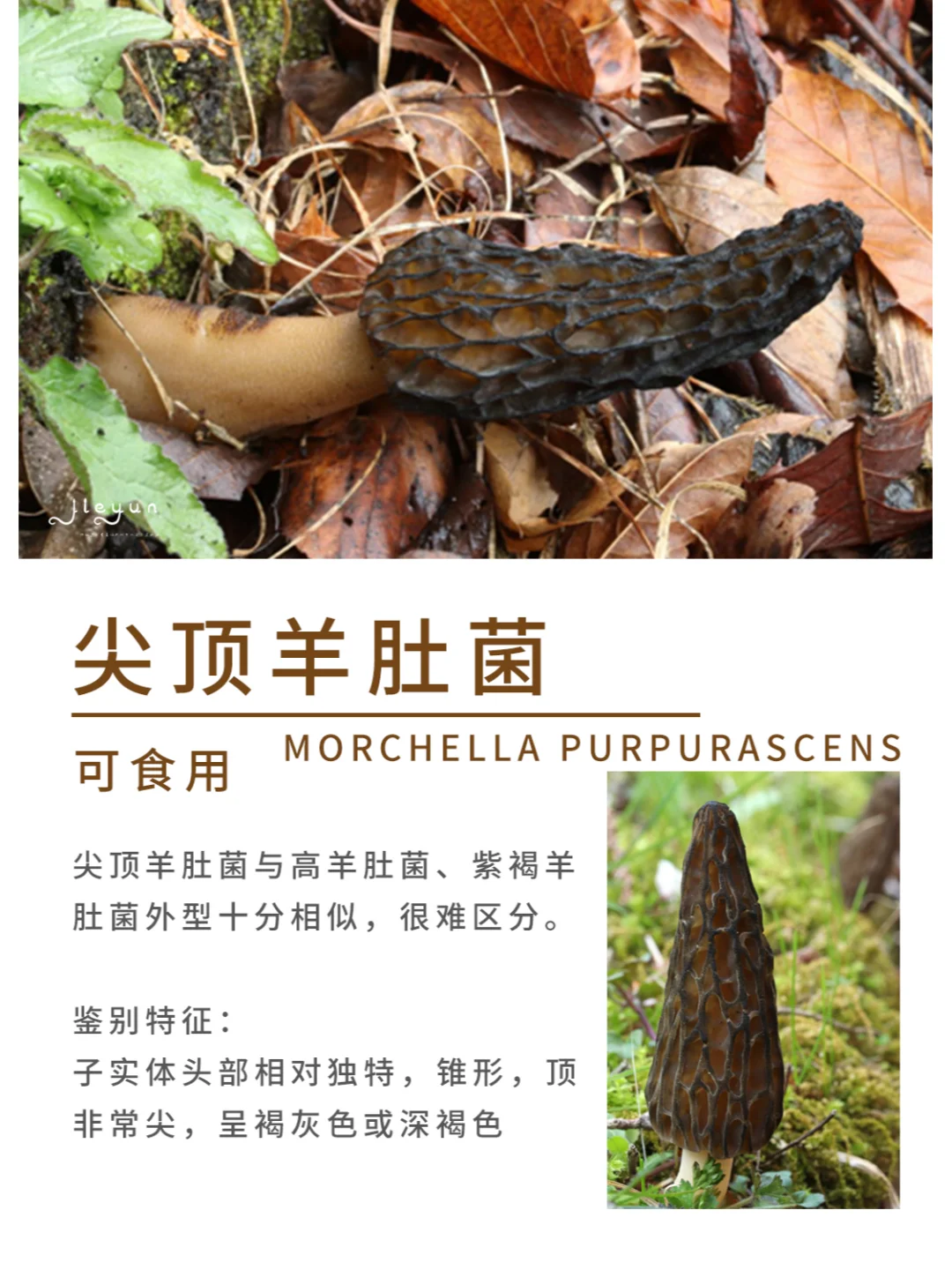 紫褐羊肚菌、高羊肚菌(Morchella elata)还有尖顶羊肚菌(Morchella conica)外型十分相似,一般肉眼很难区分他们