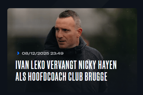 45岁的海恩自2022年起便为布鲁日效力,伊万-莱科将接替他出任蓝黑军团的主教练。