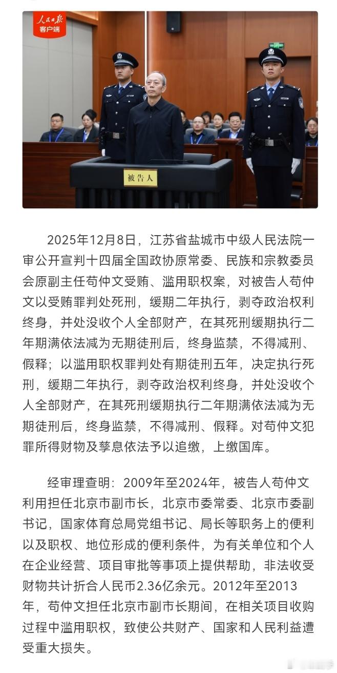 国家体育总局原局长苟仲文被判死缓!