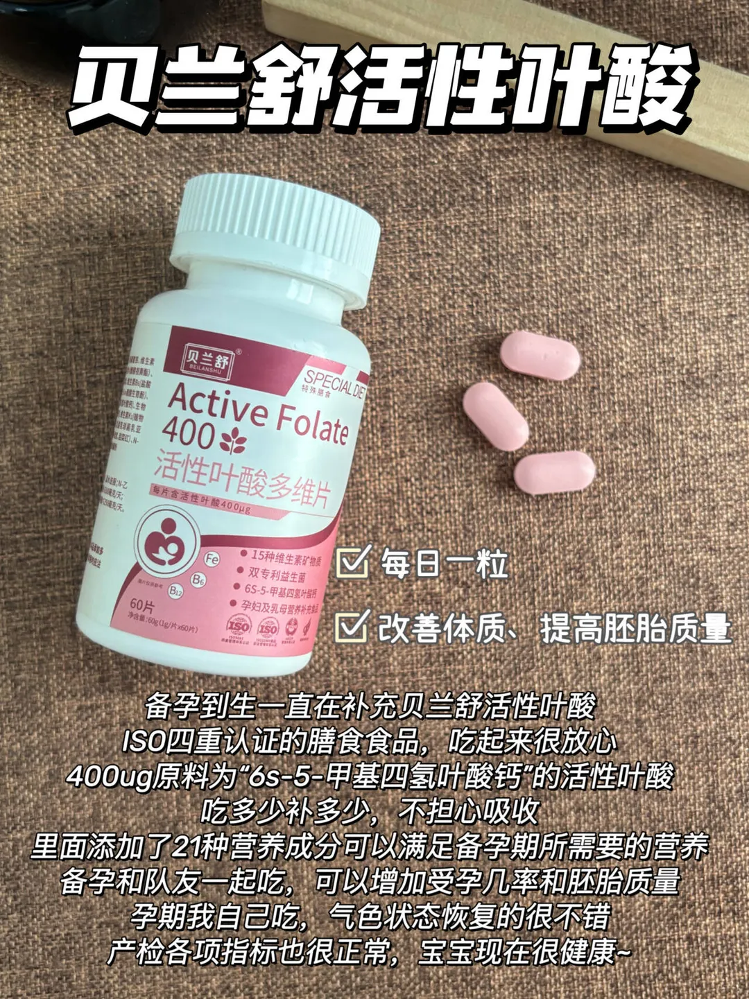 备孕到生一直在补充贝兰舒活性叶酸,ISO四重认证的膳食食品,吃起来很放心,400ug原料为“6s-5-甲基四氢叶酸钙”的活性叶酸,不担心吸收。里面添加了21种营养成分可以满足备孕期所需要的营养,备孕和队友一起吃,可以增加受孕几率和胚胎质量。孕期我自己吃,气色状态回复的很不错,产检各项指标也很正常,宝宝现在很健康~