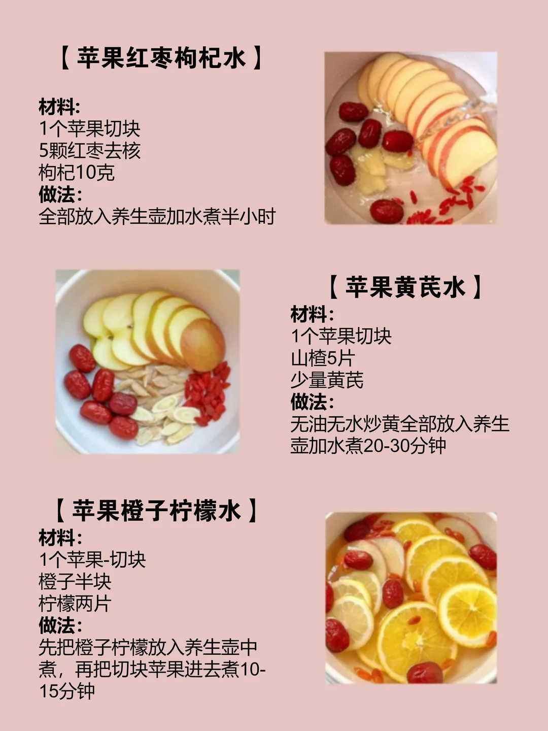 搭配一:1个苹果-切块、5颗红枣-去核、枸杞10克,全部放入养生壶加水煮半小时