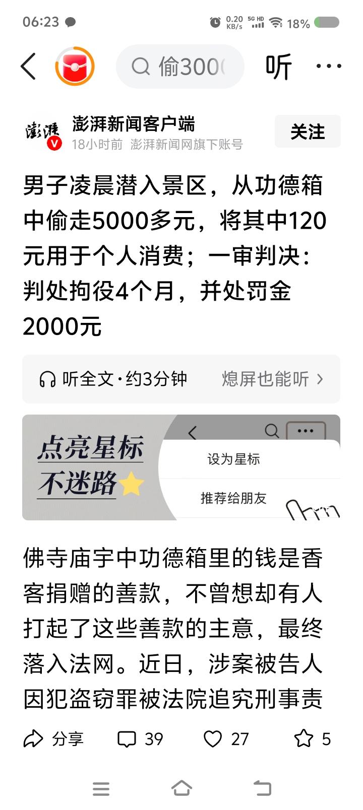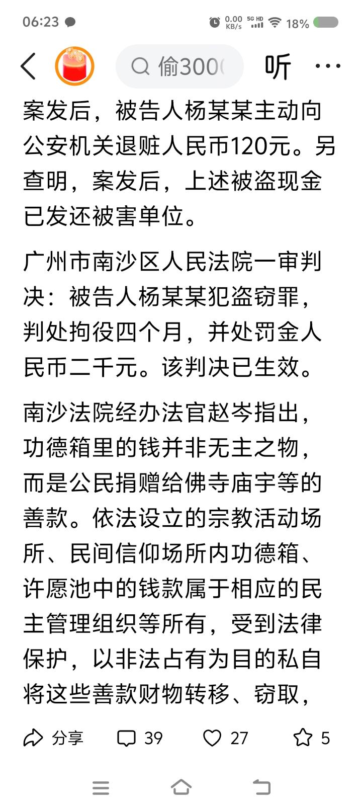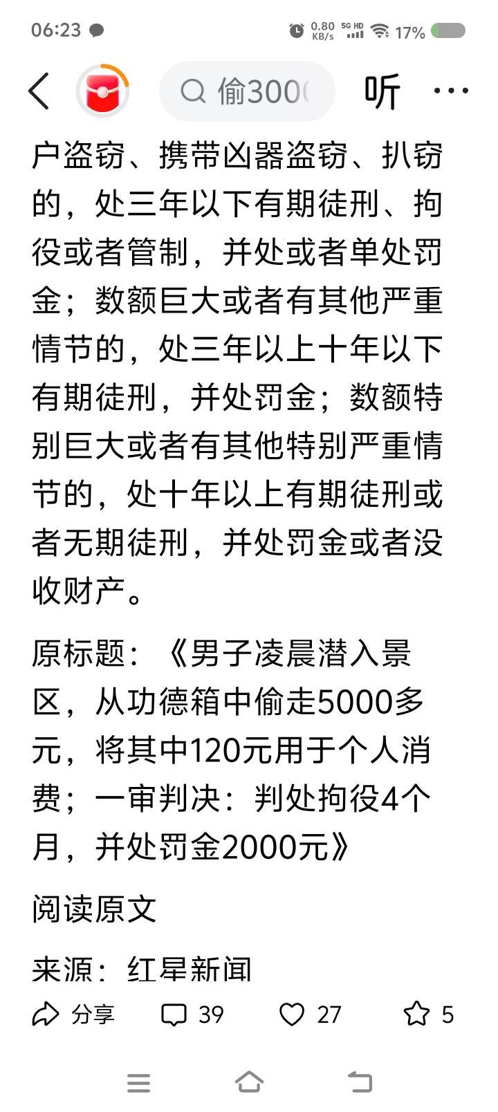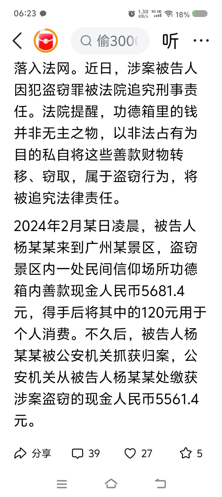 穷疯了?偷寺庙功德箱里的钱!—— 据报道,一男子凌晨在某景区盗窃五千余元,钱财来自寺庙功德箱。花了一百余元,其余赃款警方起获。 点评: 一、评论区不少杠精,为盗窃者鸣不平,讥讽寺庙。呵呵,法盲吗? 二、此人怎么想的?能半夜盗窃,不能天亮后自食其力吗?图啥哩么。亲友怎么看?如果有妻子孩子,这家还要不要?他没想过孩子的感受吗?