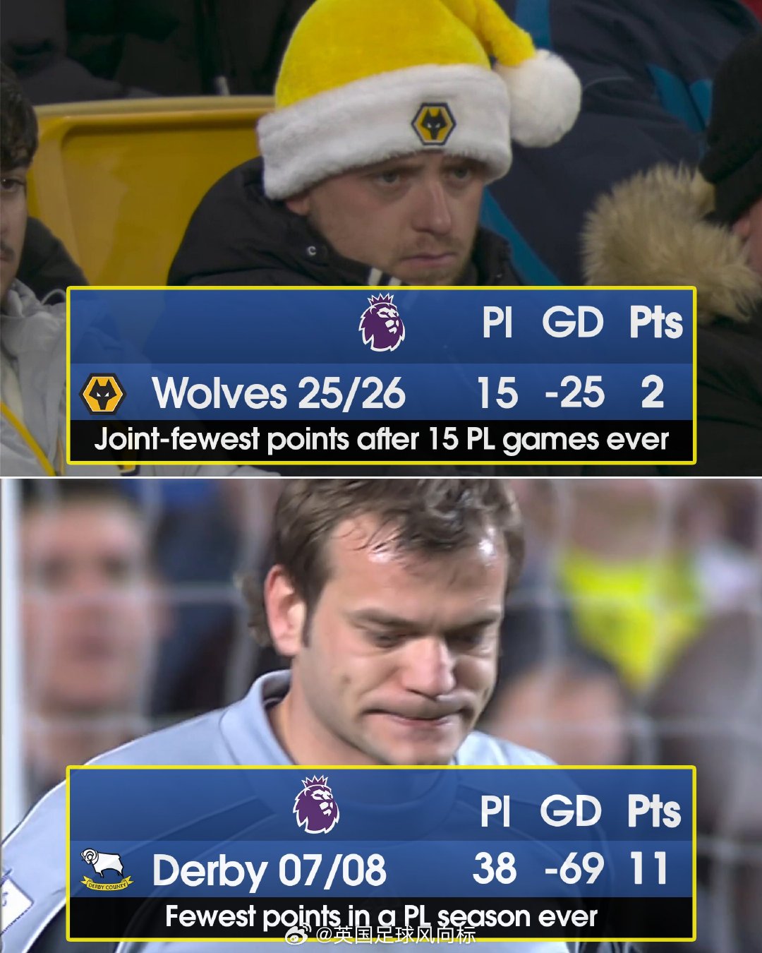 【英超史上最差开局】2025-26赛季英超联赛,狼队开季前15轮比赛,只拿到2平13负的糟糕战绩,这是英超史上并列最差的开局成绩,2020-21赛季的谢菲联,开局同样是2平13负。那个赛季,谢菲联最终以垫底的成绩降级。现在,英媒已经开始在谈论,狼队会不会打破英超赛季最低积分纪录?他们15轮之只拿到2分,德比郡在2007-08赛季,全季只拿到11分。PS:接下来4轮,狼队的对手是阿森纳、布伦特福德、利物浦和曼联。狼队1比4曼联 英超联赛