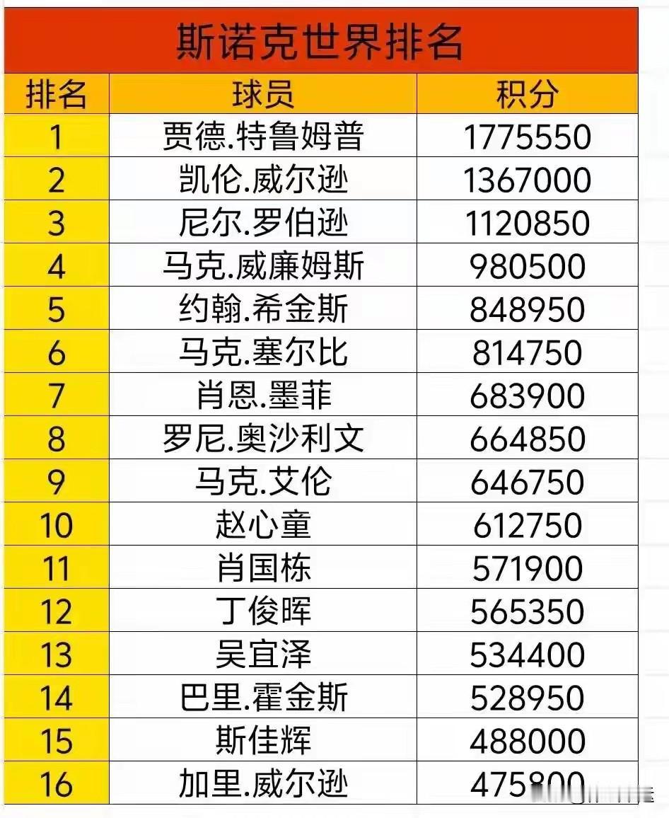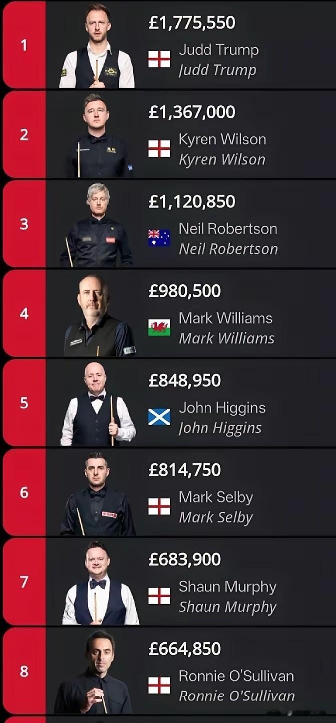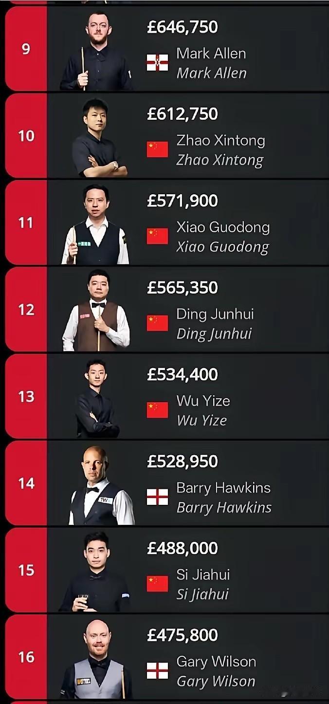 2025年12月8日的斯诺克英锦赛太精彩了!塞尔比10 - 8战胜特鲁姆普夺冠,这含金量十足。他拿到第10个三大赛冠军,还完成第三圈大满贯,太牛了。 夺冠后塞尔比世界排名从第11位飙升到第6位,奖金也拿到了25万英镑,而特鲁姆普拿了10万英镑,排名还是第一。 再看看咱中国选手,丁俊晖扣掉同期亚军奖金,下滑4位跌到第12,跌出前十了,不过参加大师赛和世锦赛问题不大。赵心童排第10,是唯一进前十的中国选手。 塞尔比这实力,就算之前跌出前十,也能迅速打回来,真不愧是顶尖高手。 斯诺克16强 斯诺克总决赛
