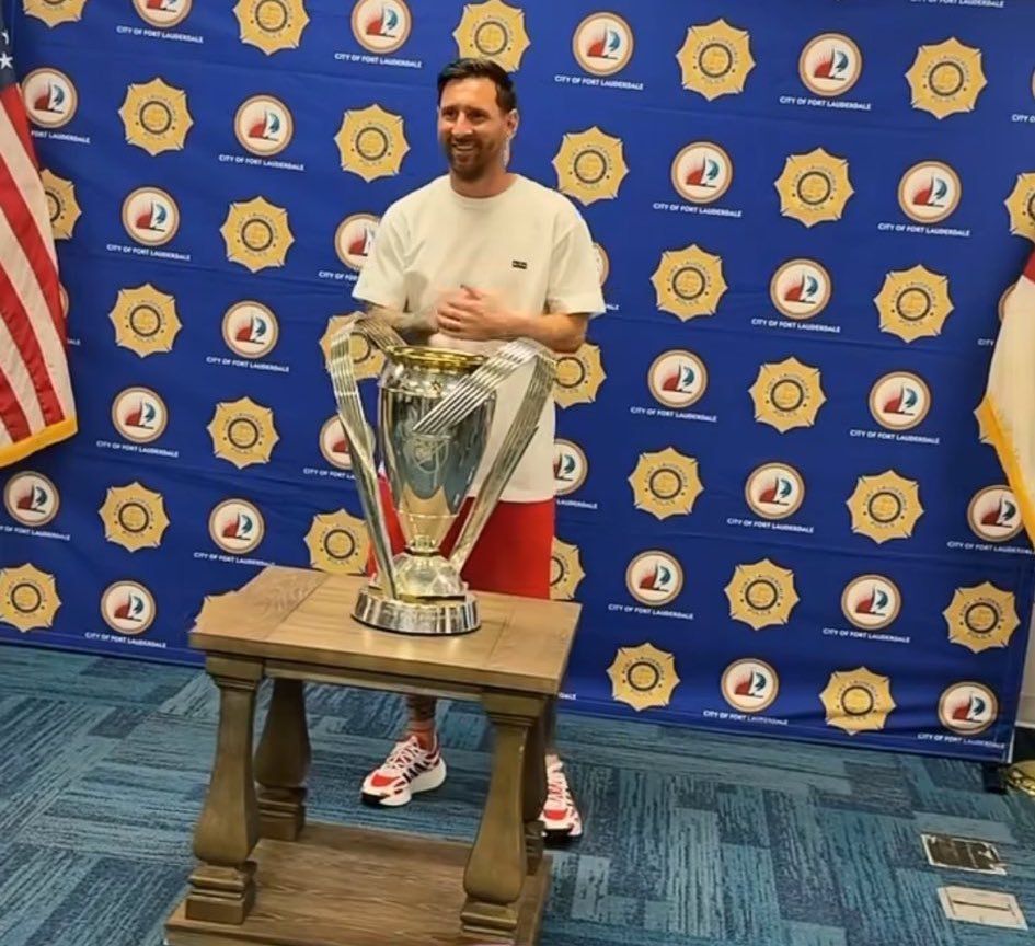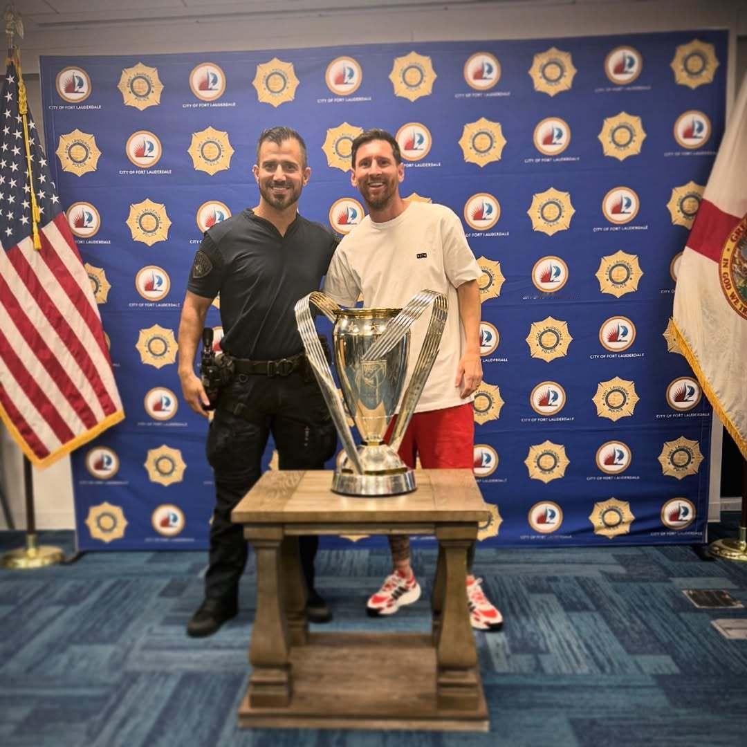 🏆梅西携冠军奖杯造访劳德代尔堡警局。迈阿密国际首夺总冠军 梅西发文说我们是MLS冠军 梅西