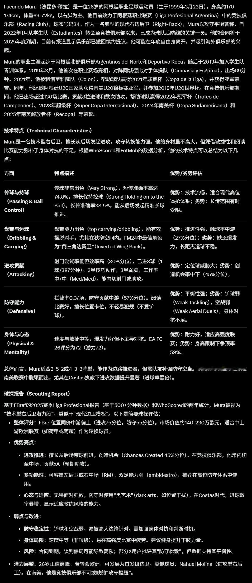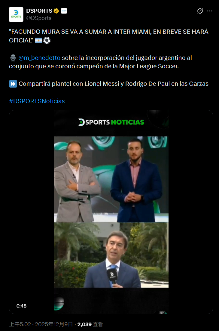 【转会动态】DSports记者Marcelo Benedetto:阿根廷竞技足球俱乐部右后卫法昆多·穆拉即将加盟迈阿密国际,官方消息即将公布。迈阿密国际