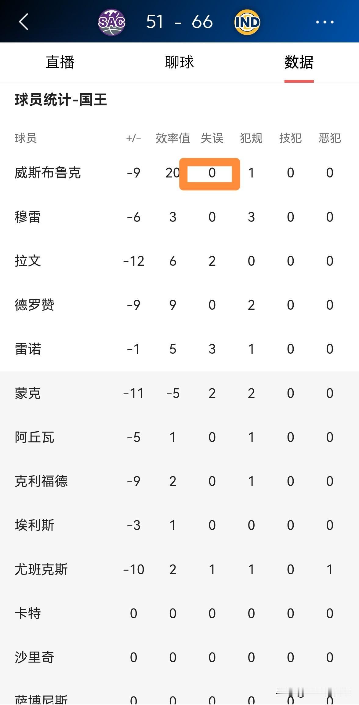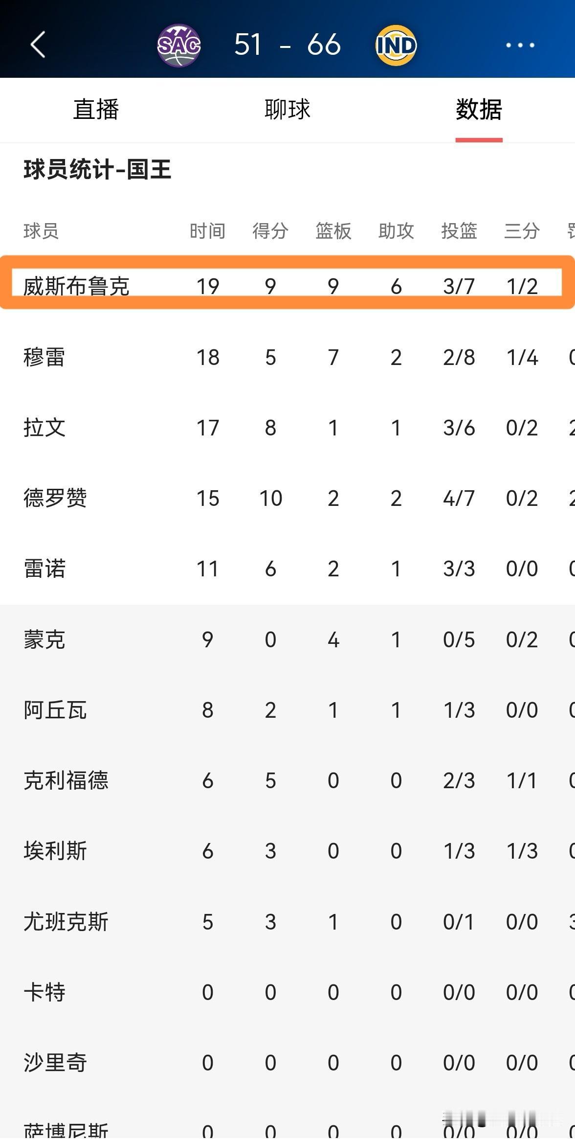 我真为国王老将威斯布鲁克感到由衷的高兴!在今天国王客场挑战步行者的上半场比赛中,如果国王目前以51:66落后于对手,但是威少在攻防两端都打出了无可争议的表现。 在前两节比赛中,威少首发出战19分钟,投篮7中3,其中三分球2中1、罚球4中2得到9分9篮板6助攻1抢断。 在上半场比赛中,威少最让人感到满意的地方在于他没有出现任何的失误。