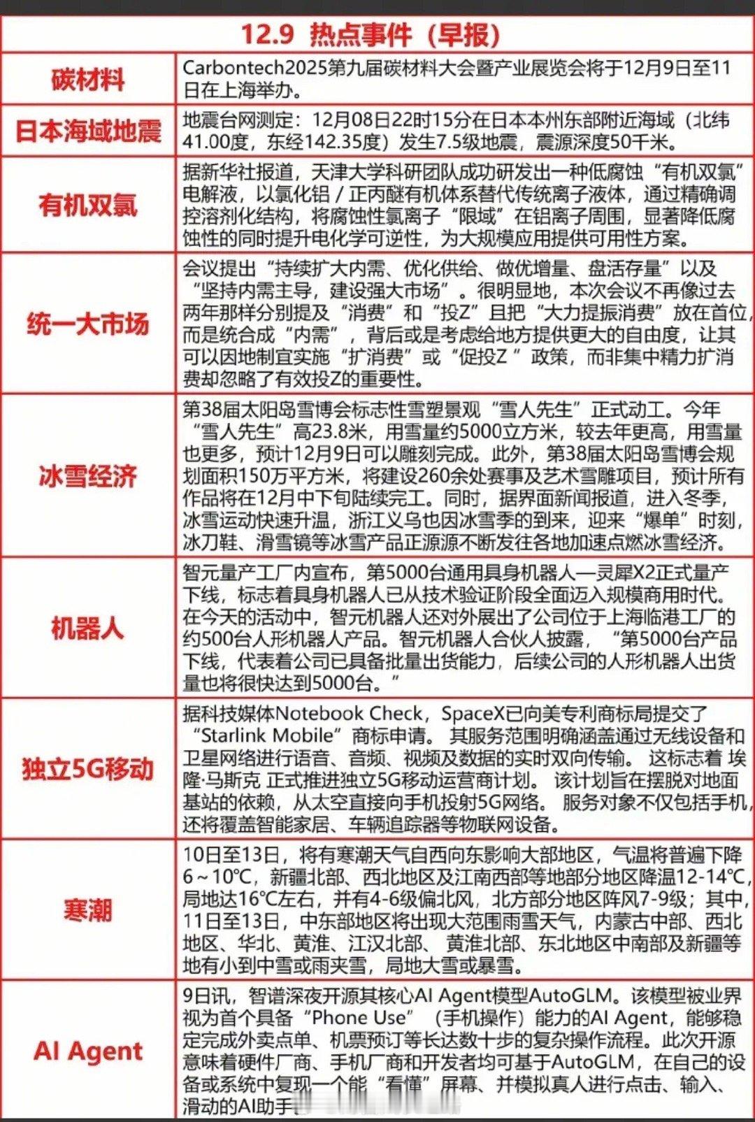 12.9周二 财经热点汇总!1.碳材料2.日本地震3.有机双氯4.统一大市场5.独立5G移动6.机器人