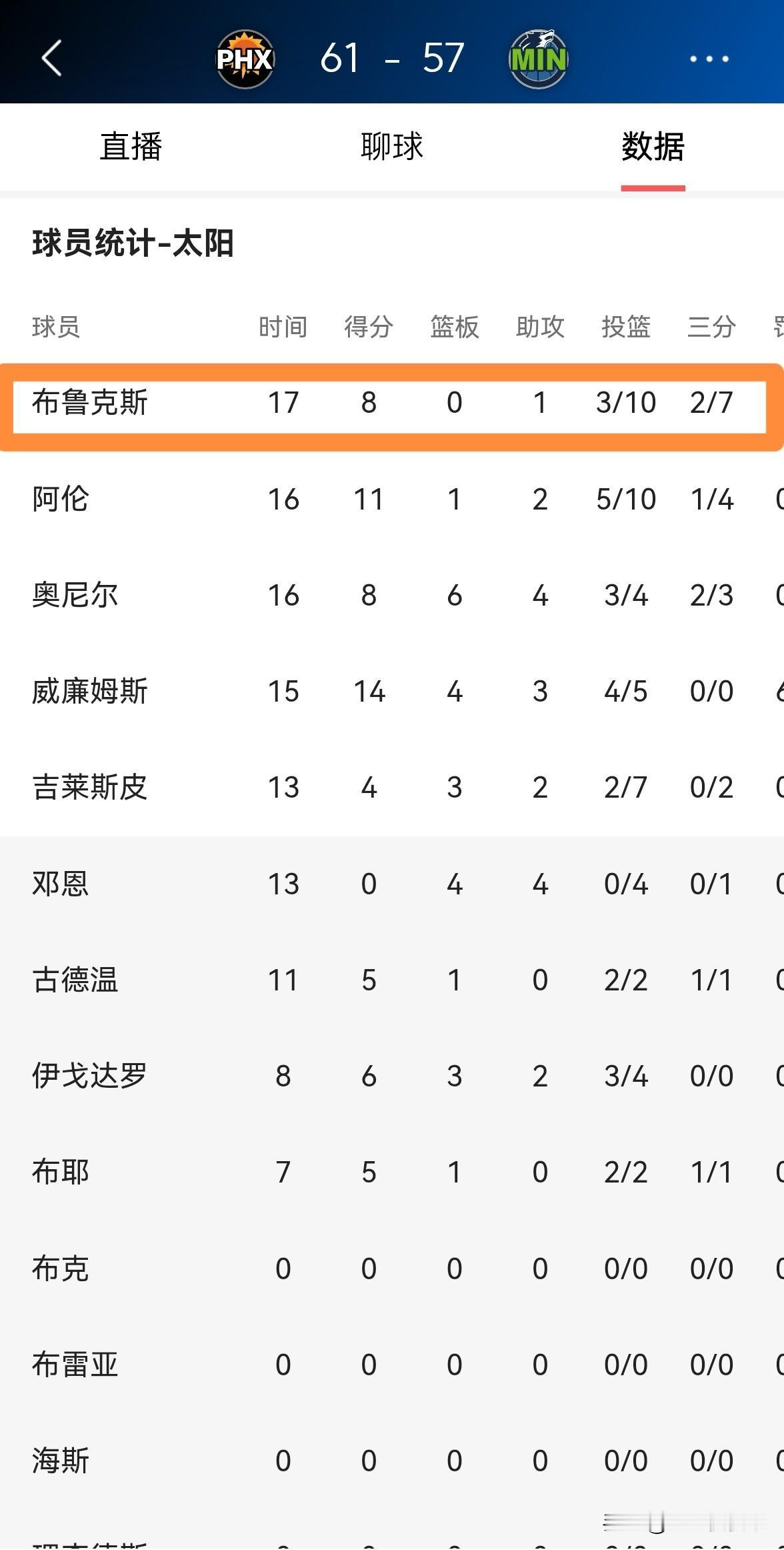 太阳大将狄龙-布鲁克斯真是太拉胯了!在今天太阳客场挑战森林狼的上半场比赛中,狄龙的手感真是太冰凉了,他在首发出战的17分钟里,投篮10中3,其中三分球7中2非常低效的得到8分。好在太阳的其他球员发挥出色,太阳才在上半场比赛结束时以61:57领先对手。 以狄龙在上半场比赛中的糟糕表现来看,他完全不配称作球队的核心和领袖。