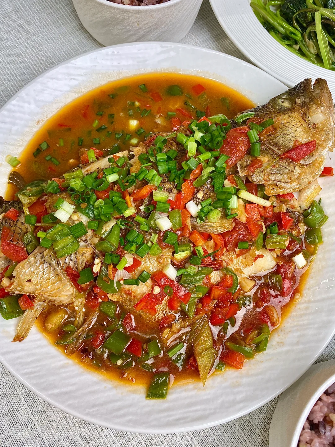 今天晚餐长这样 分享下饭家常菜教程 具体做法往后翻,每道菜都有详细的教程介绍 今日菜单: [星R]茄汁鲈鱼 [星R]酸辣香干 [星R]清炒地瓜叶 好好吃饭,拒绝外卖~