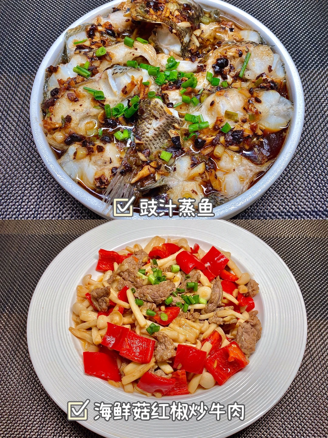 今天晚餐长这样 分享下饭家常菜教程 具体做法往后翻,每道菜都有详细的教程介绍 今日菜单: [星R]豉汁蒸鱼 [星R]海鲜菇红椒炒牛肉 [星R]冰草沙拉 [星R]槐花蛋饼 好好吃饭,拒绝外卖~