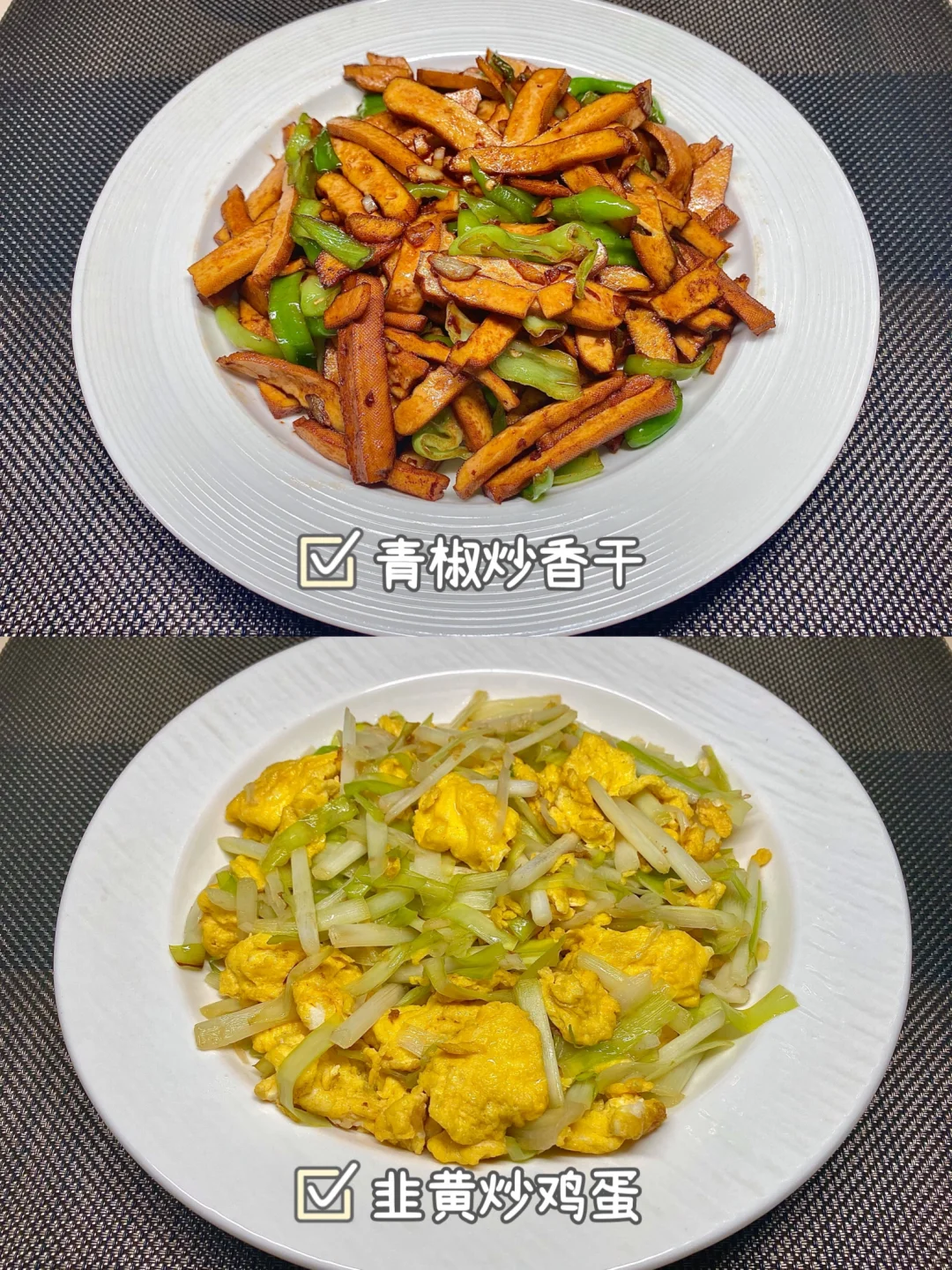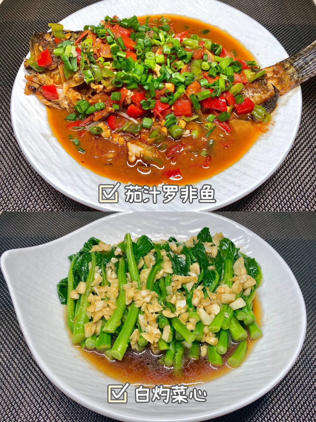 今天晚餐长这样 笔记灵感 分享下饭家常菜教程 具体做法往后翻,每道菜都有详细的教程介绍 今日菜单: [星R]茄汁罗非鱼 [星R]白灼菜心 [星R]青椒炒香干 [星R]韭黄炒鸡蛋 好好吃饭,拒绝外卖~