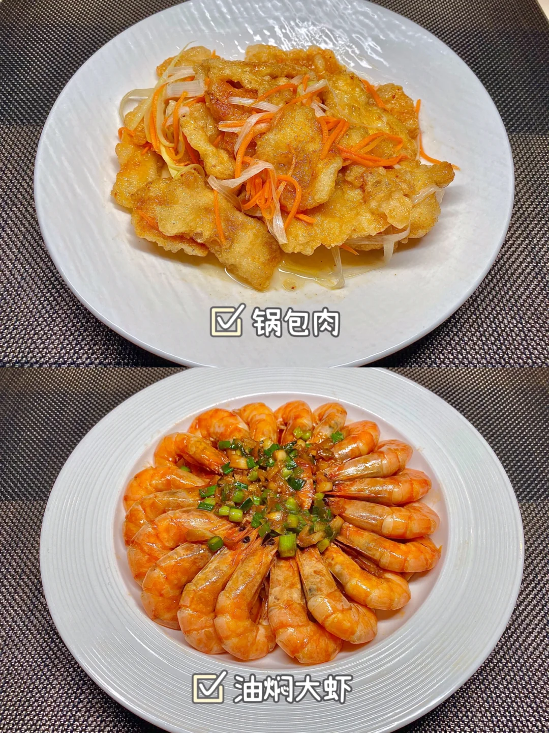 今天晚餐长这样 笔记灵感 分享下饭家常菜教程 具体做法往后翻,每道菜都有详细的教程介绍 今日菜单: [星R]锅包肉 [星R]油焖大虾 [星R]青椒炒蛋 [星R]清炒胡萝卜丝 好好吃饭,拒绝外卖~
