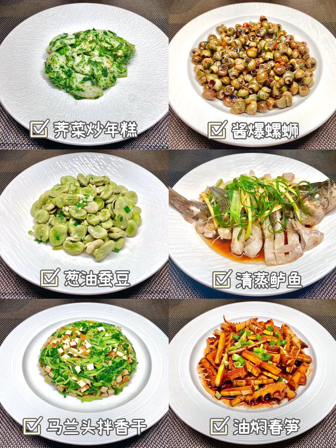 荠菜炒年糕、酱爆螺蛳