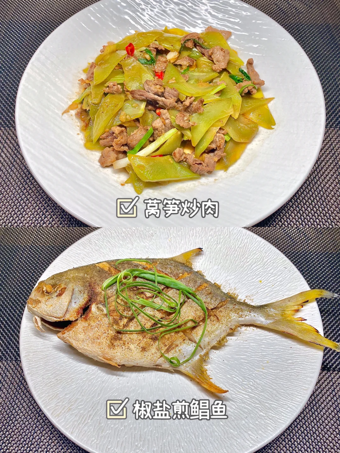 今天晚餐长这样 笔记灵感 分享下饭家常菜教程 具体做法往后翻,每道菜都有详细的教程介绍 今日菜单: [星R]莴笋炒肉 [星R]椒盐煎鲳鱼 [星R]小炒西葫芦 [星R]水蒸蛋 好好吃饭,拒绝外卖~