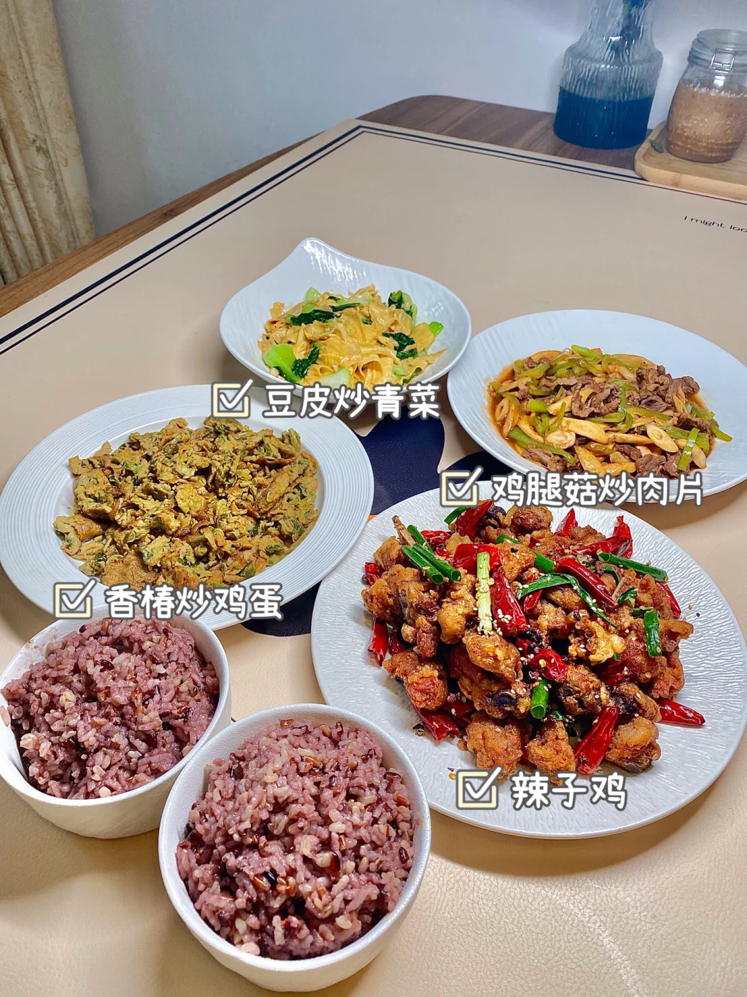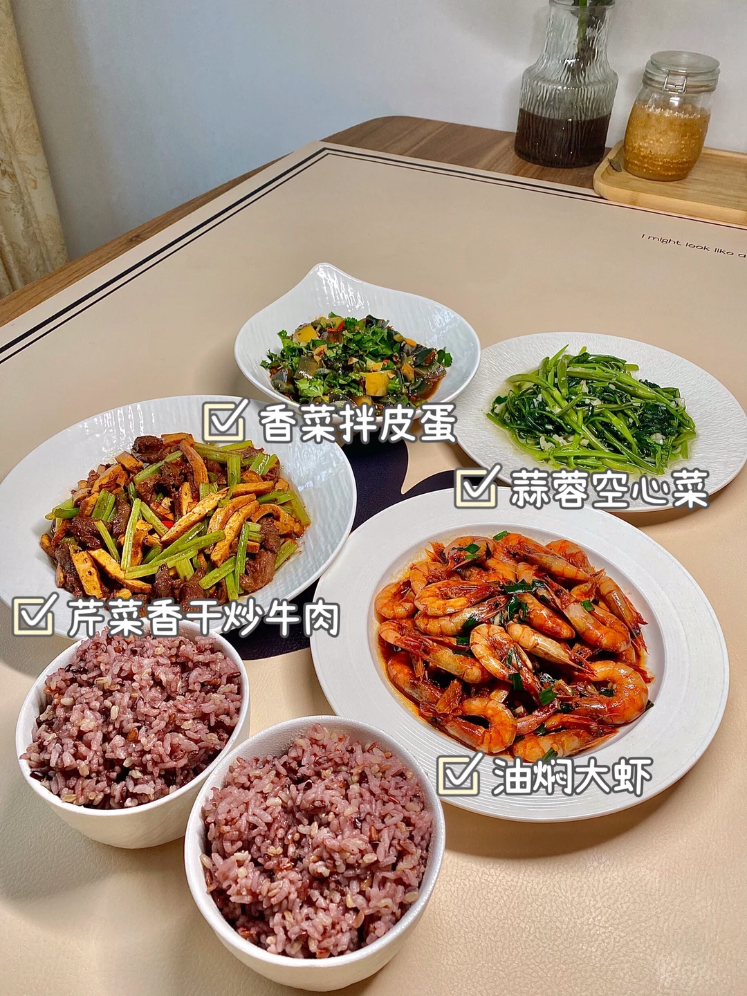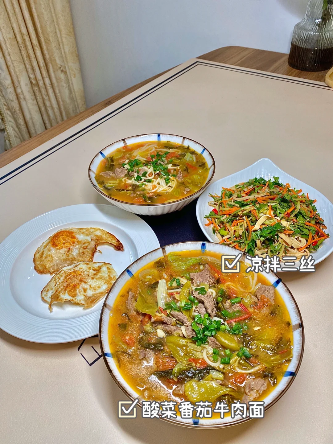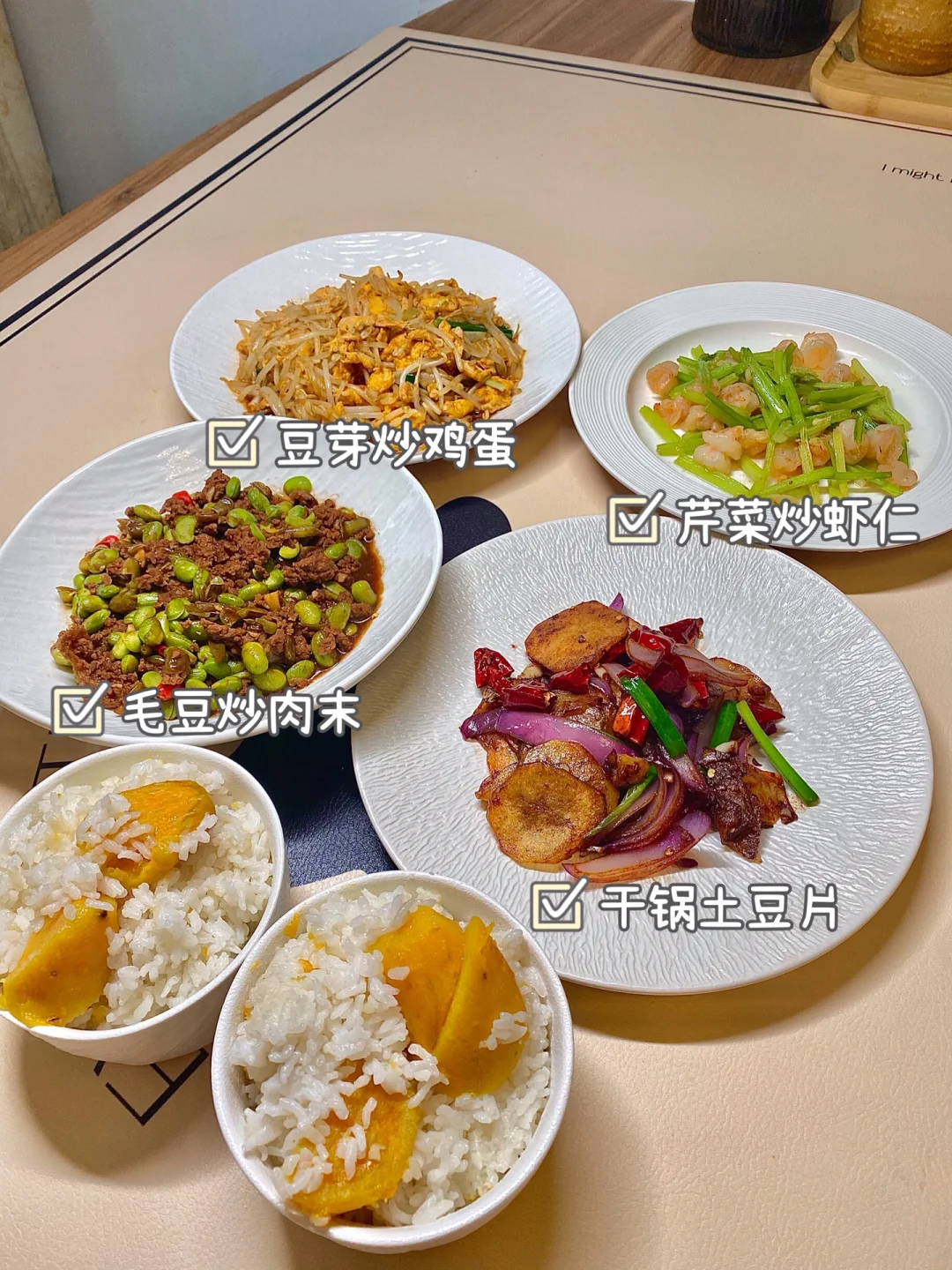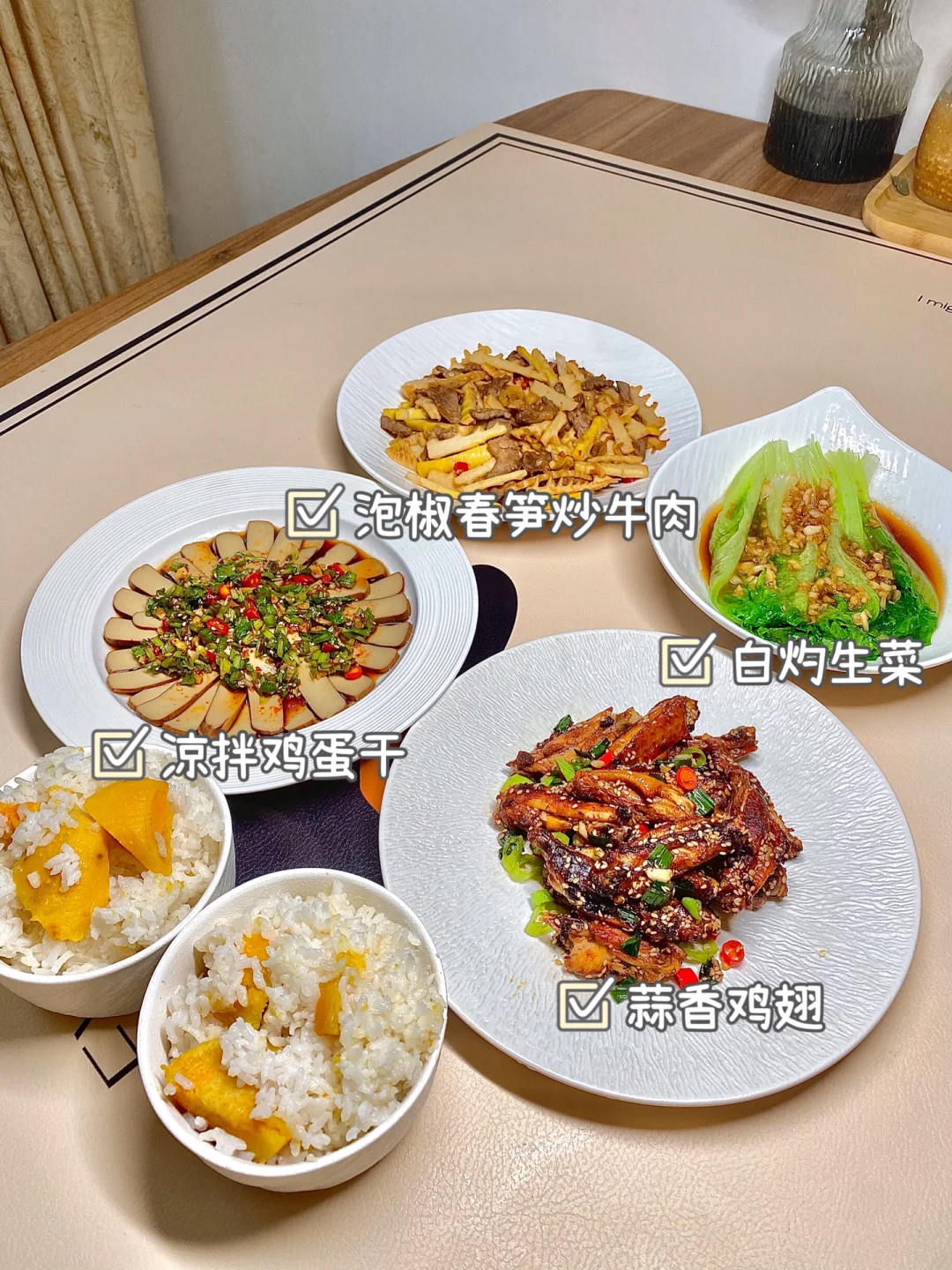 今天晚餐长这样 笔记灵感 一周七天不重样下饭家常菜合集 做法主页都有详细的教程介绍 一周菜单合集: 1⃣️酸菜番茄牛肉面、凉拌三丝 2⃣️小炒牛肉、可乐鸡翅年糕 蒜蓉太湖菜、炒三丝 3⃣️芹菜香干炒牛肉、香菜拌皮蛋 油焖大虾、蒜蓉空心菜 4⃣️毛豆炒肉末、芹菜炒虾仁 干锅土豆片、豆芽炒鸡蛋 5⃣️辣子鸡、鸡腿菇炒肉片 香椿炒鸡蛋、豆皮炒青菜 6⃣️宫保虾仁、凉拌茄子 清蒸鲈鱼、清炒莴笋丝 7⃣️蒜香鸡翅、凉拌鸡蛋干 泡椒春笋炒牛肉、白灼生菜 好好吃饭,拒绝外卖~