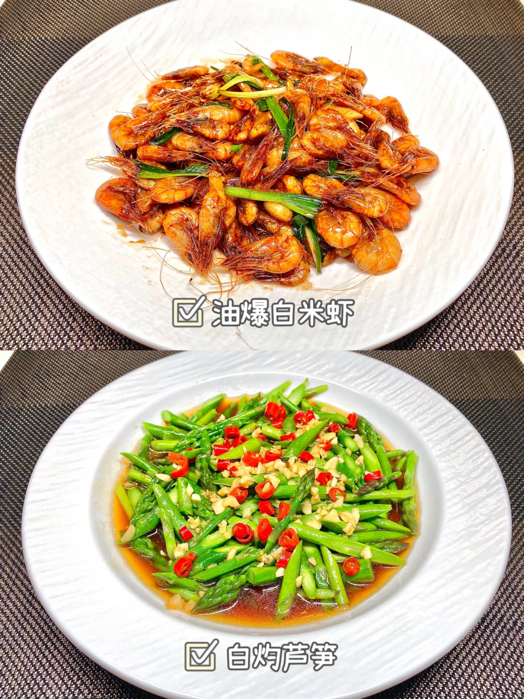 今天晚餐长这样 笔记灵感 分享下饭家常菜教程 具体做法往后翻,每道菜都有详细的教程介绍 今日菜单: [星R]油爆白米虾 [星R]白灼芦笋 [星R]水蒸蛋 [星R]香煎带鱼 [星R]清炒胡萝卜丝