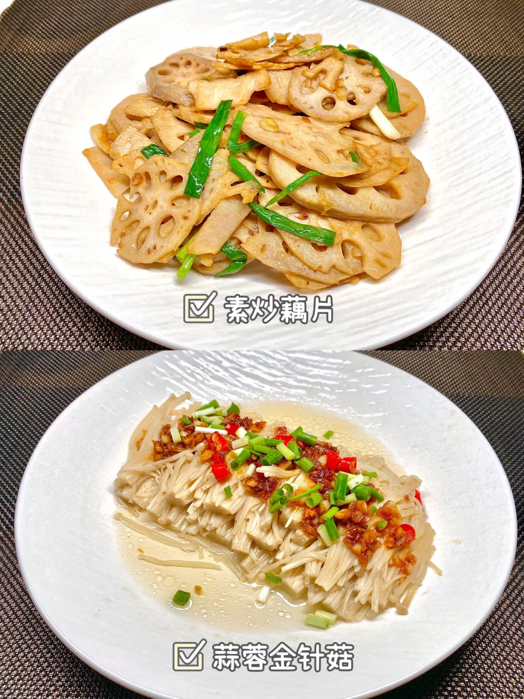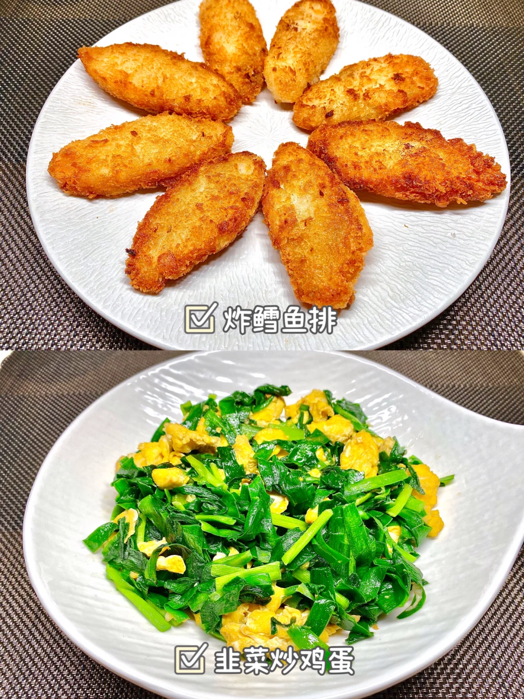 今天晚餐长这样 笔记灵感 分享下饭家常菜教程 具体做法往后翻,每道菜都有详细的教程介绍 今日菜单: [星R]炸鳕鱼排 [星R]韭菜炒鸡蛋 [星R]素炒藕片 [星R]蒜蓉金针菇 好好吃饭,拒绝外卖~