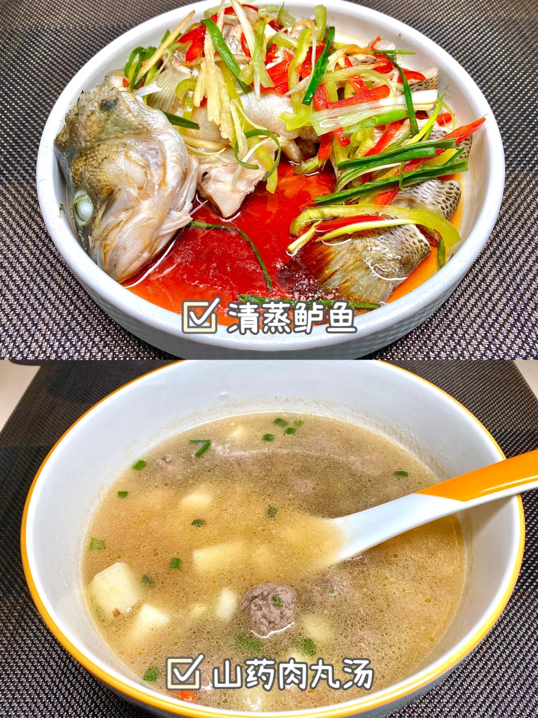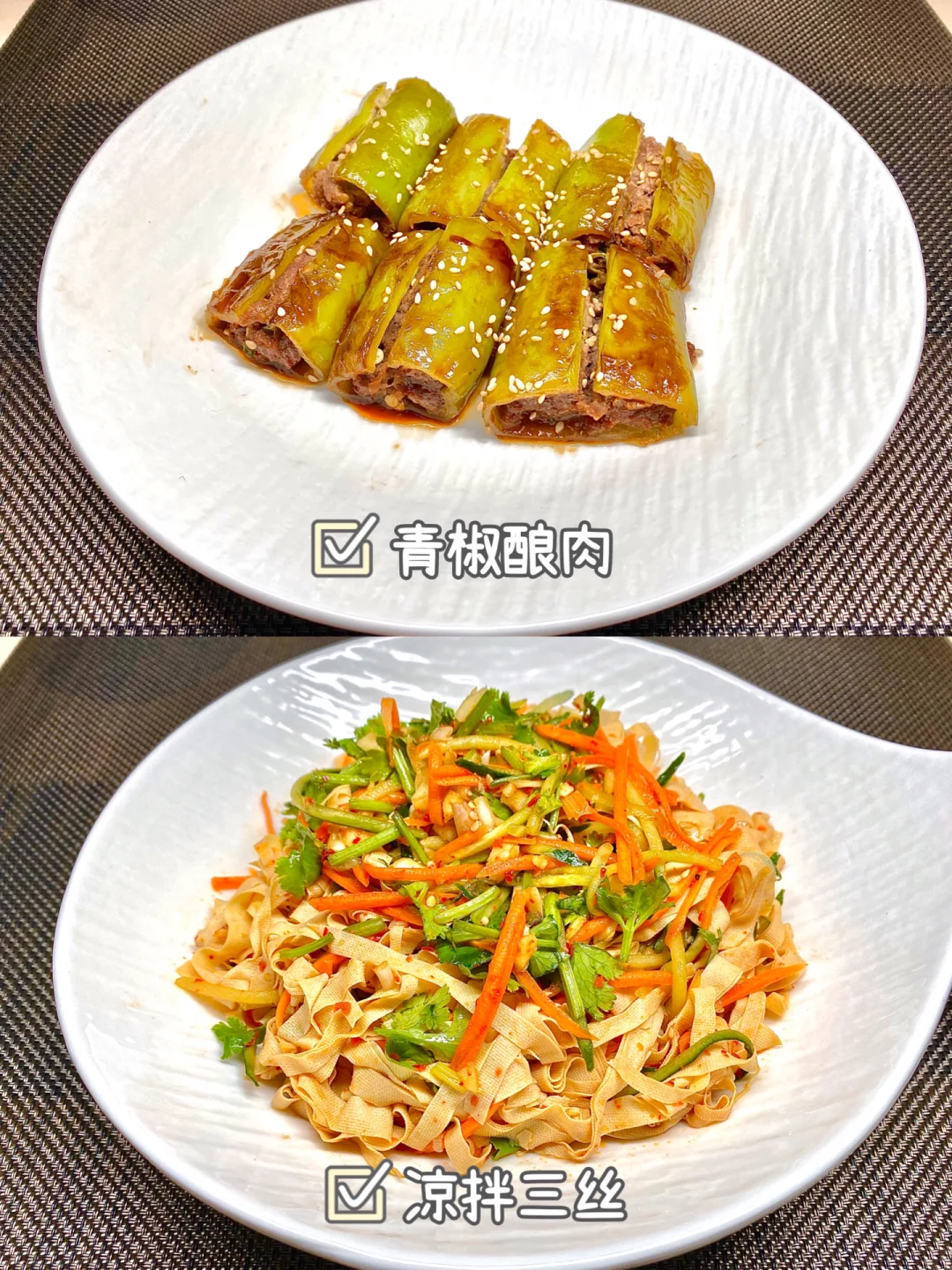 今天晚餐长这样 笔记灵感 分享下饭家常菜教程 具体做法往后翻,每道菜都有详细的教程介绍 今日菜单: [星R]青椒酿肉 [星R]凉拌三丝 [星R]清蒸鲈鱼 [星R]山药肉丸汤 [星R]油炸臭豆腐