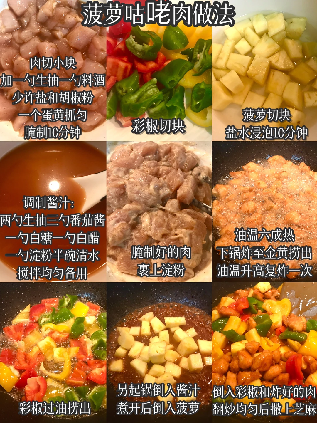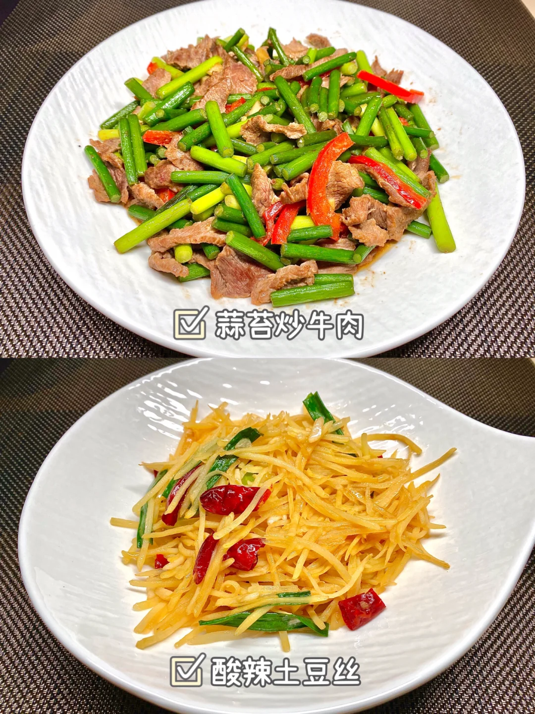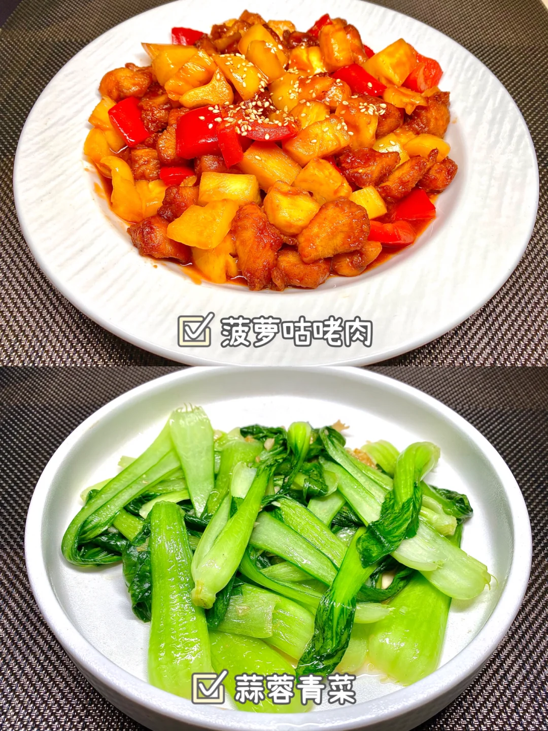 今天晚餐长这样 笔记灵感 分享下饭家常菜教程 具体做法往后翻,每道菜都有详细的教程介绍 今日菜单: [星R]菠萝咕咾肉 [星R]蒜蓉青菜 [星R]蒜苔炒牛肉 [星R]酸辣土豆丝 好好吃饭,拒绝外卖~
