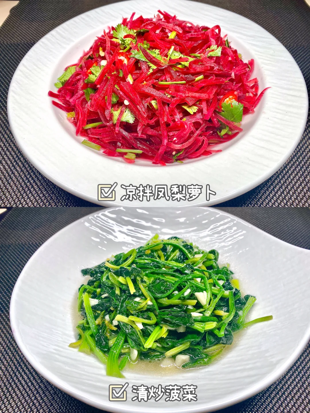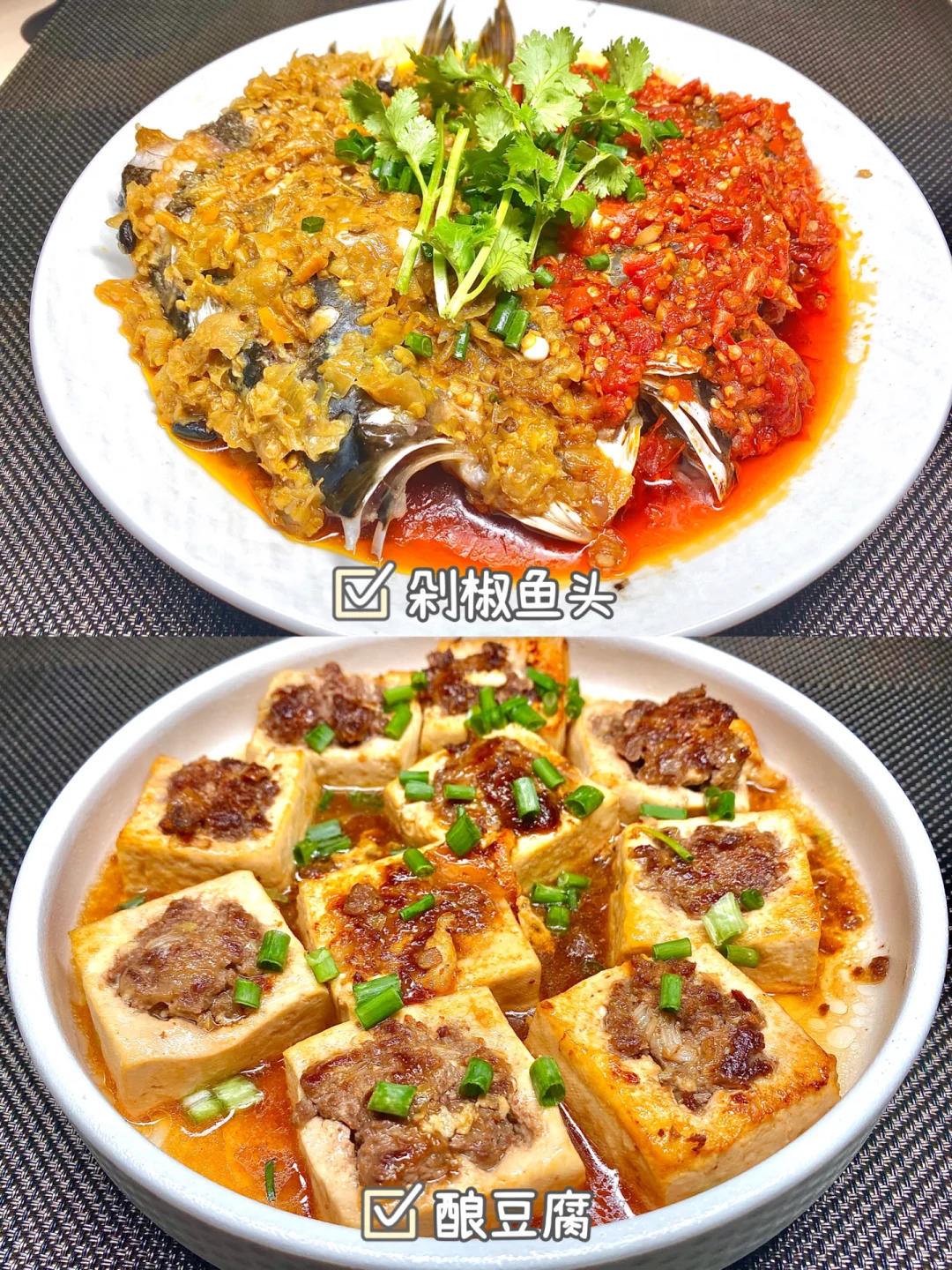 今天晚餐长这样 笔记灵感 分享下饭家常菜教程 具体做法往后翻,每道菜都有详细的教程介绍 今日菜单: [星R]剁椒鱼头 [星R]酿豆腐 [星R]凉拌凤梨萝卜 [星R]清炒菠菜
