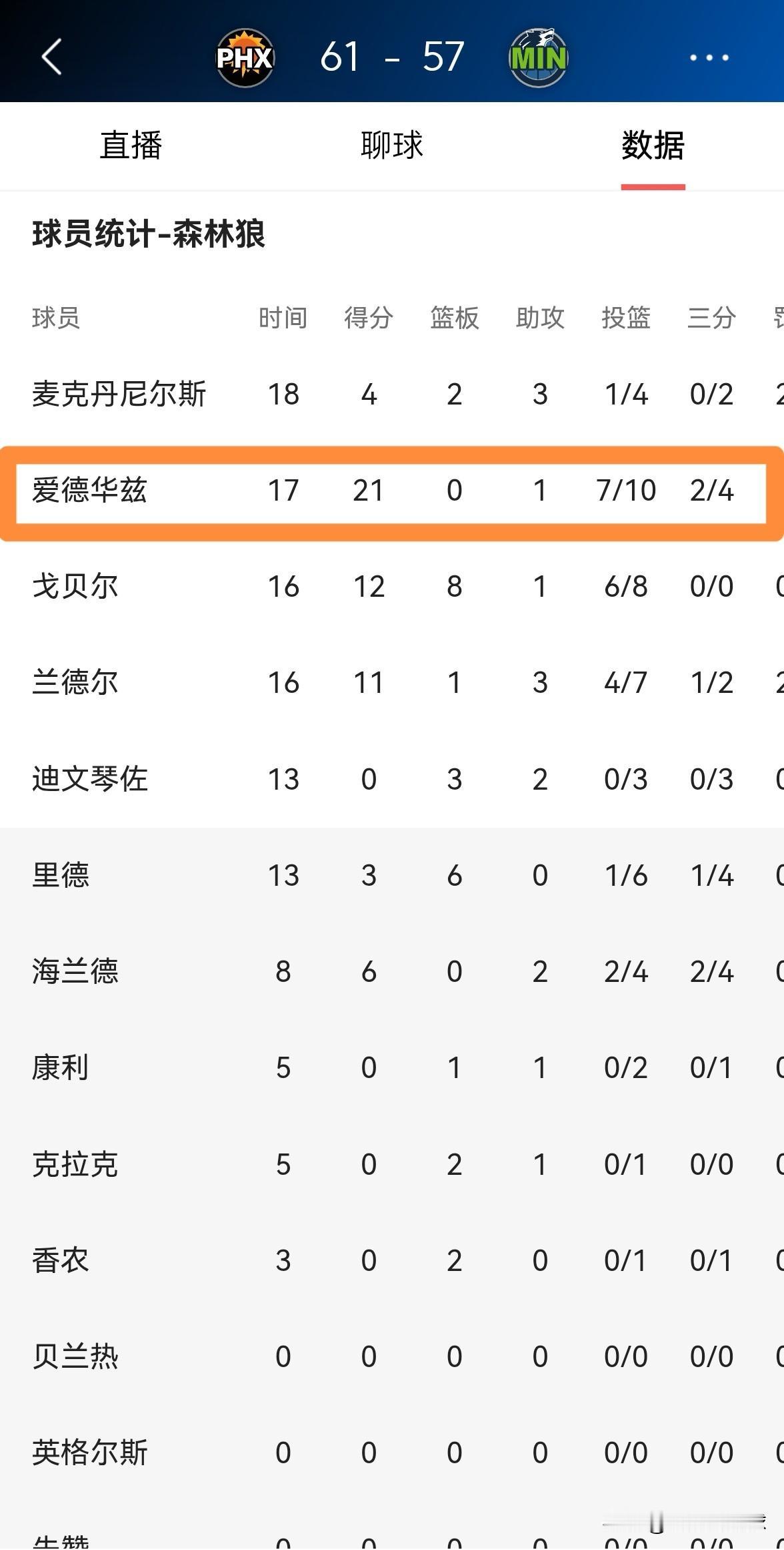 森林狼当家球星爱德华兹真是太能得分了!在今天进行的森林狼和太阳的比赛中,目前双方半场战罢,森林狼以57:61落后于对手。在前两节比赛中,爱德华兹首发出战17分钟,投篮10中7,其中三分球4中2、罚球6中5爆砍21分,没有出现任何的失误。 能够在短短的两节比赛中就砍下21分,这足以证明爱德华兹的得分能力,爱德华兹毫无疑问是当今联盟最顶级的得分手之一。