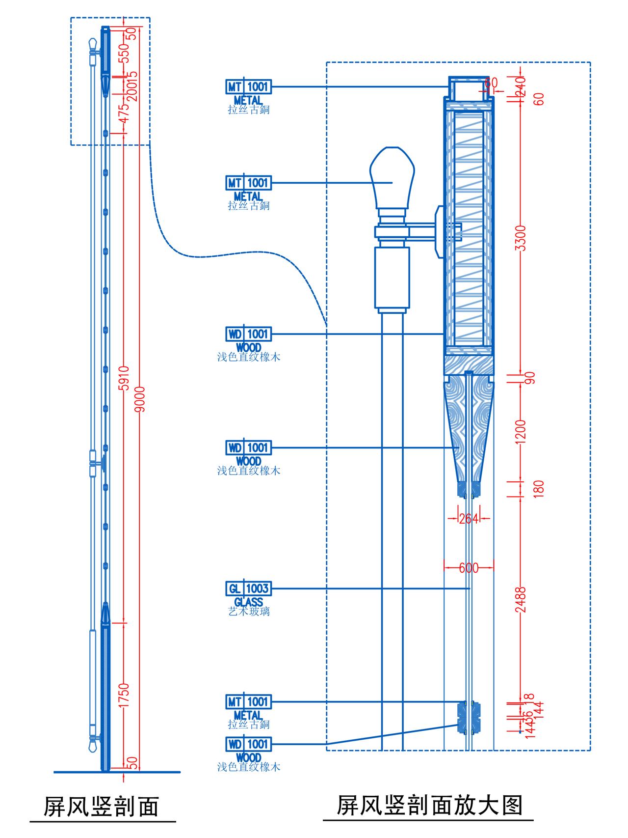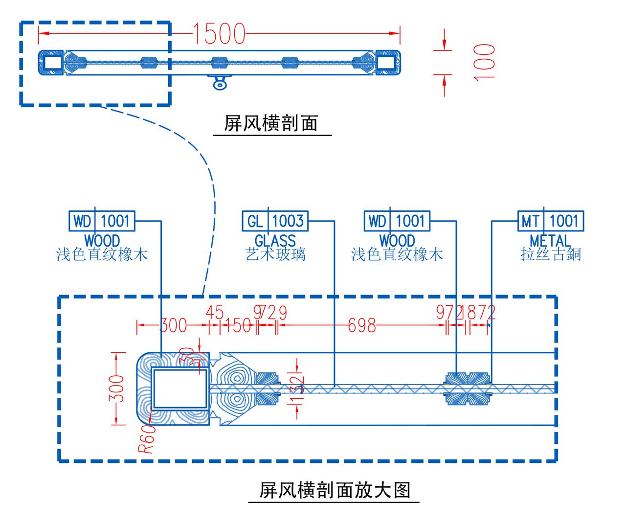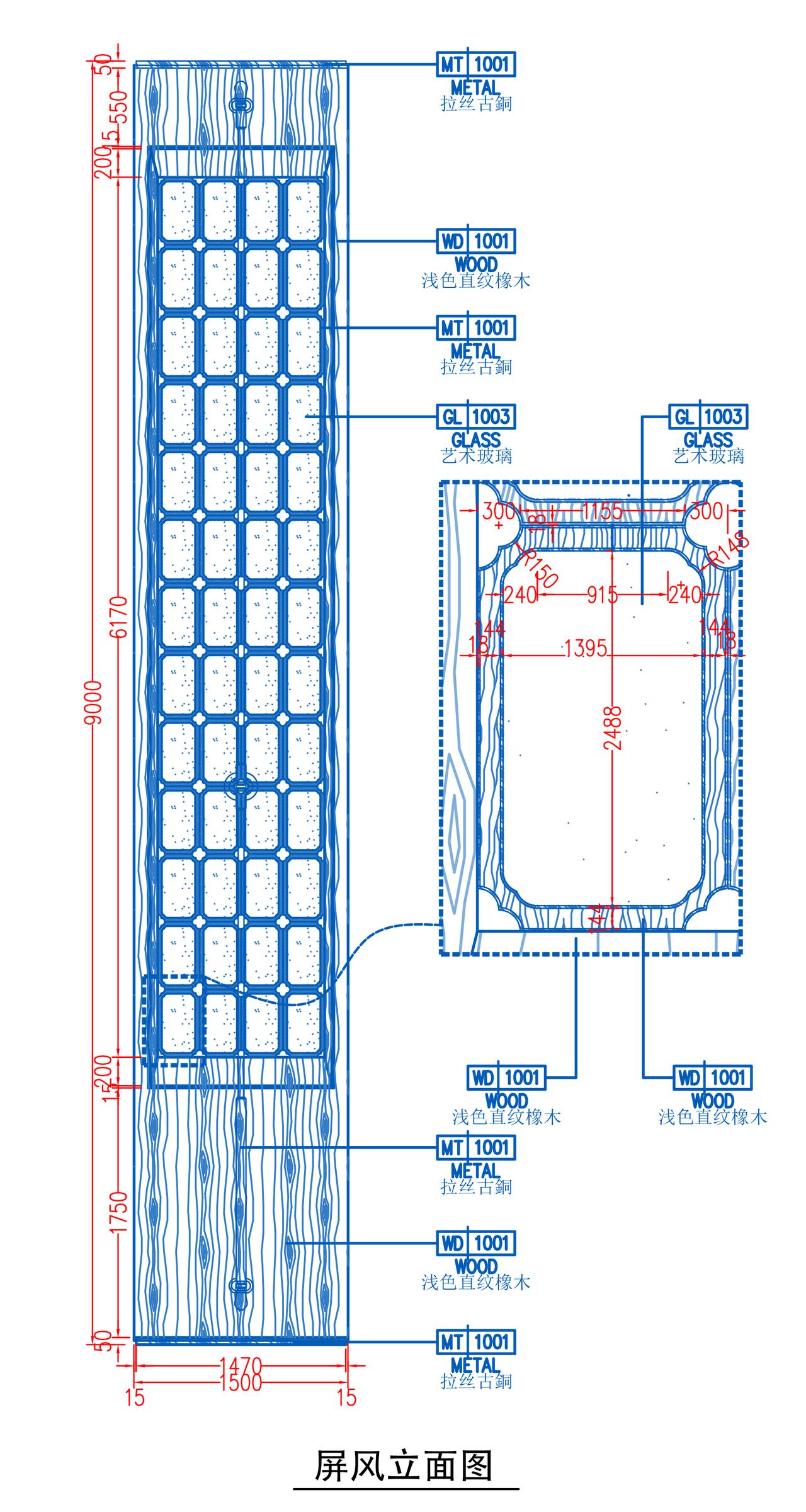 《高级感实木屏风施工图指引》 整体结构为浅色直纹橡木+艺术玻璃+金属五金,精