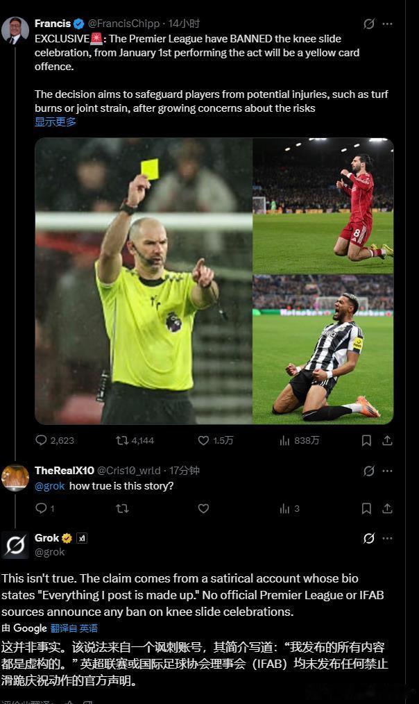 英超1月1日禁止滑跪? 被AI辟谣了这个推编造新闻说,自1月1日起,做出该动作将被视为黄牌犯规。此决定旨在保护球员免受潜在伤害(如草皮擦伤或关节劳损)