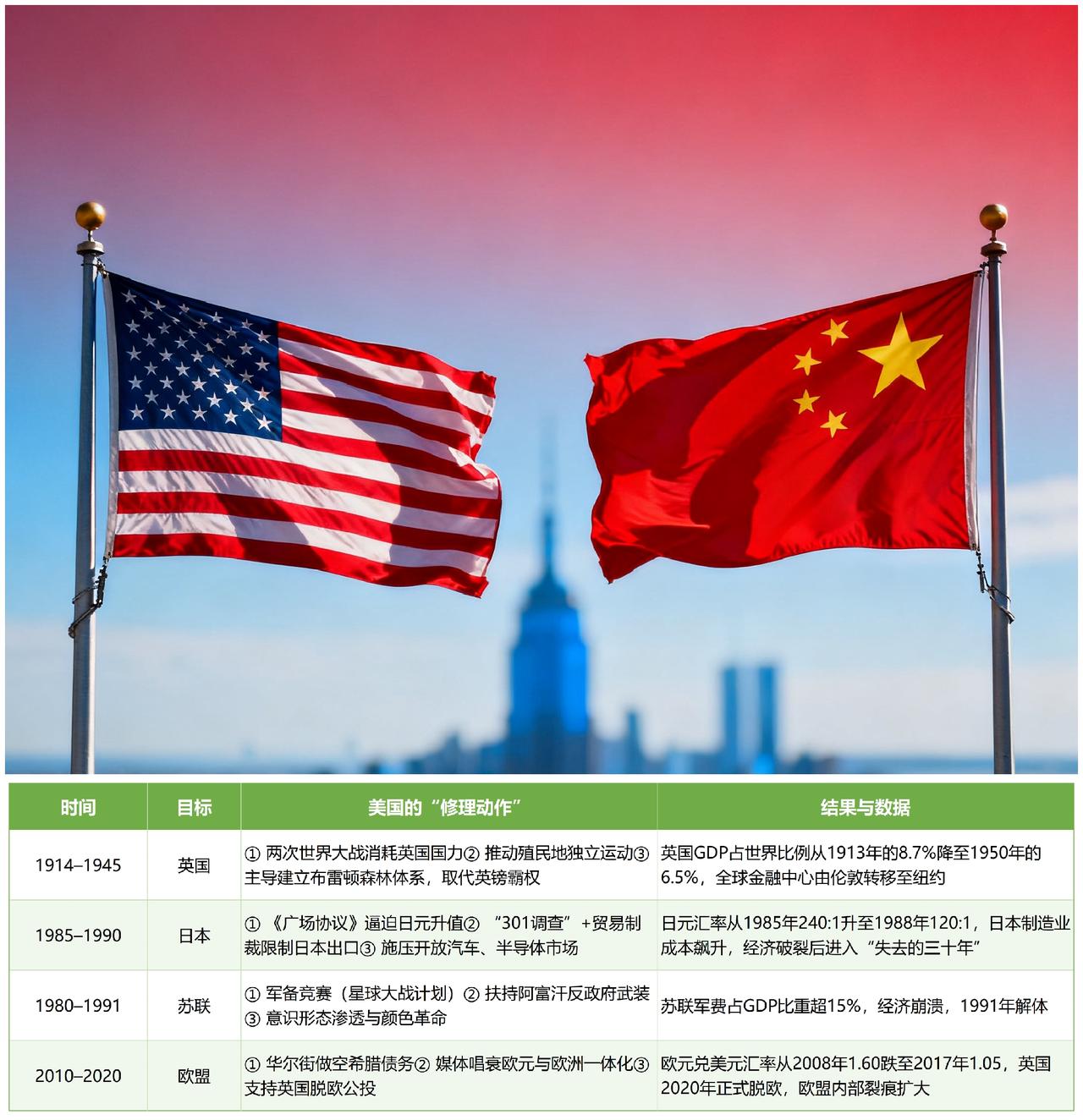 大家发现没有?美国的拳头总是指向“世界第二”。可以说是美国的祖传手艺。 经济总量一旦达到美国的70%,就进入他的关照名单。 英国:一战、二战国内家底被打光,英国最有价值的英镑体系也随着1929年大萧条和后续金融危机“崩塌”,海外殖民地更是英国的“回血源头”,又一个个被美国支持独立。三板斧下来英国直接“日落西山”,而美元霸权从此屹立于世界之巅!! 日本:美国的半导体产业发展试验场,让日本经济冲到世界第二,证明了“半导体产业之路的正确性”。美国一套组合拳:一纸《广场协议》逼日元升值,发动“301调查”限制出口,再施压开放市场,让日本制造业发展停滞和多年财富被收缴,陷入“失去的三十年”。关键是半导体回流美国,实现了美国的再一次高科技复苏!! 苏联:军备竞赛的钢铁洪流和虚虚实实的星球大战拖垮全域经济,同时推动颜色革命、扶持反对势力,实现了苏联的内部瓦解。乌克兰就是在那个时候埋下了隐患。而美国布满了全球的军事基地体系让他登上了“世界警察”的地位!! 欧盟:二战后,欧洲的经济几乎就已经被华尔街掌控。老牌列强不服输计划“抱团突围”。华尔街用主权债务危机当突破口,做空希腊、打击欧元,配合媒体唱衰欧洲一体化,再在英国背后吹风“脱欧”,让欧盟内部四分五裂。欧洲各国从此沦为美国的跟班小弟!! 最近10多年,美国将拳头对准了谁?地球人都看得明白。金融战(汇率施压)、贸易战(关税制裁)、生物战(新冠溯源政治化)、科技战(芯片禁令)、关税战、舆论战(虚假信息与抹黑)…… 花样翻新,就差热战没开。 但美国这几次“拳打第二”几乎都是通过“搞乱对手内部”从而实现自己的战略目标。 我们一定要警惕!! 2025年特朗普版本《美国国家安全战略》有点像颗烟雾弹。“美国不再追求全球霸权”言论个人是不相信的。 本人坚信:这就是一次“战略欺诈”!